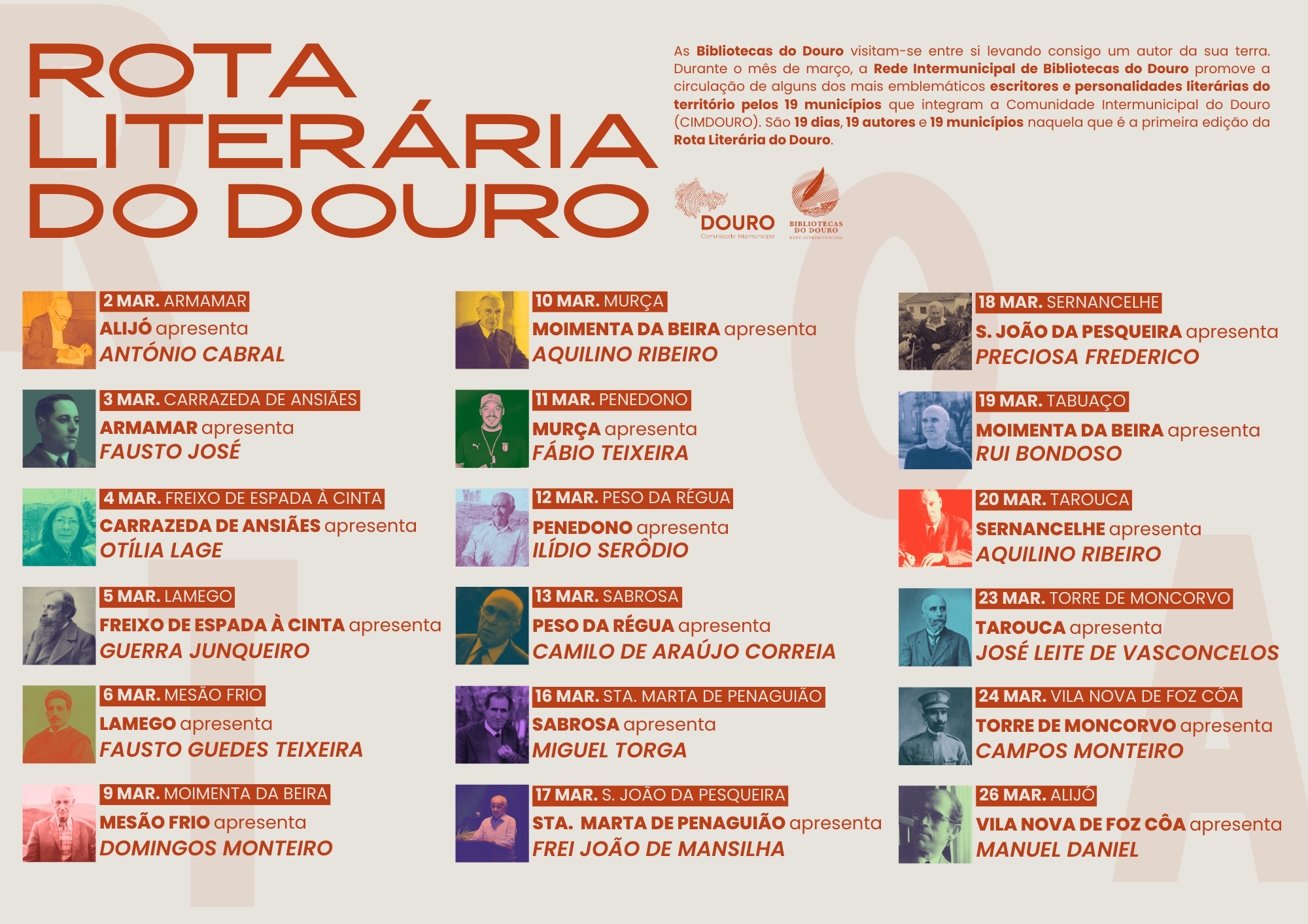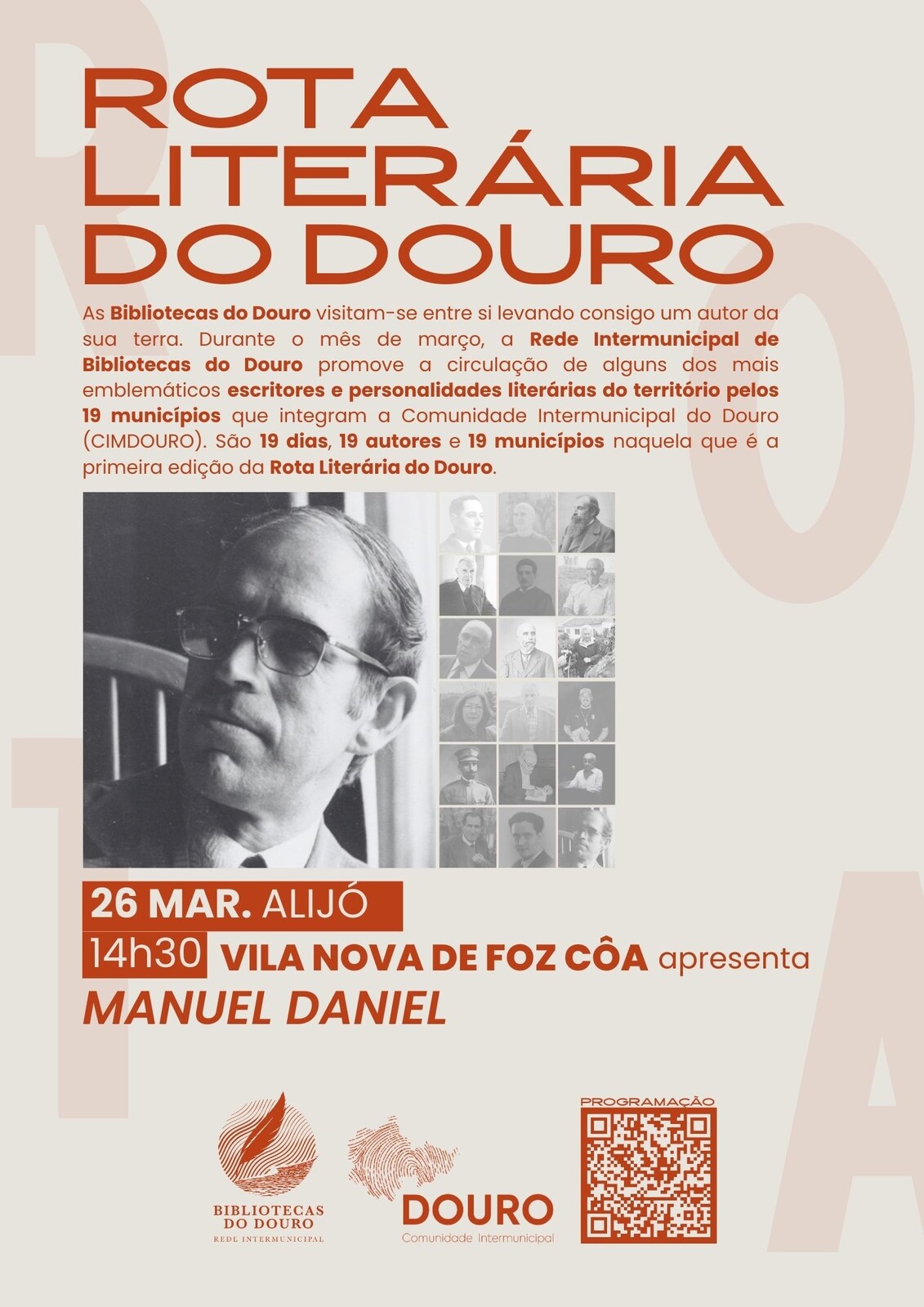 A Biblioteca Municipal de Vila Nova de Foz Côa vai apresentar o poeta Manuel Daniel na Biblioteca Municipal de Alijó no próximo dia 26 de março, no âmbito da primeira edição da Rota Literária do Douro. Durante 19 dias, os municípios do Douro trocam autores e histórias numa rota que liga bibliotecas, leitores e território.