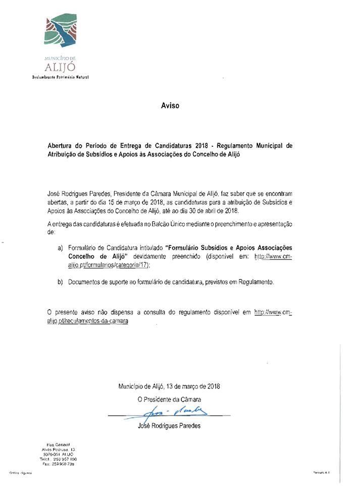 De 15 de março de 2018 a 30 de abril de 2018 decorre o período de candidaturas para a Atribuição de Subsídios e Apoios às Associações do Concelho de Alijó