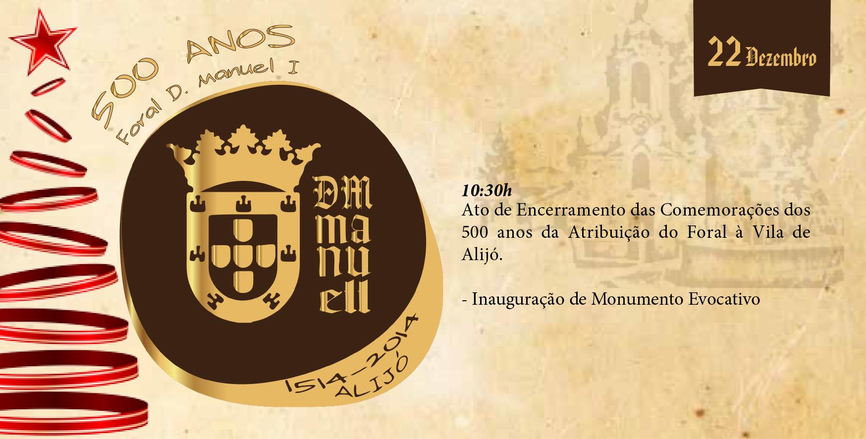 O Município de Alijó tem a honra de convidar a população para o Ato de Encerramento das Comemorações dos 500 anos da Atribuição do Foral à Vila de Alijó, que decorrerá no dia 22 de dezembro, pelas 10.30 horas, no jardim Dr. Matos Cordeiro, com a Inauguração do Monumento Evocativo dos 500 anos da Atribuição de Foral à Vila de Alijó.