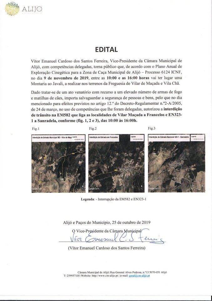 Dado o ato venatório do próximo dia 9 de novembro usar de um elevado número de armas de fogo e matilhas de cães, e importando salvaguardar a segurança de pessoas e bens, no dia mencionado para efeito do previsto no artigo 12.º do Decreto-Regulamentar n.º2-A/2005, de 24 de março, no uso de competências que lhe foram delegadas, a GNR autorizou a interdição de trânsito na EM582 que liga as localidades de Vilar Maçada a Francelos e EN323-1 a Sanradela, conforme (fig. 1, 2 e 3) do edital em anexo, das 10:00h às 16:00h.
