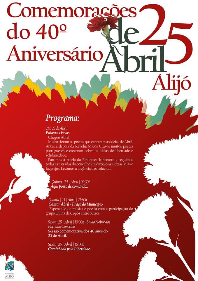 O Município de Alijó vem por este meio informar que a partir desta data os eventos e atividades previamente programados para o mês de abril, a decorrer no Teatro Auditório Municipal de Alijó, foram cancelados. Exceção feita para as Comemorações do Quadragésimo Aniversário da Revolução do 25 de Abril, que passam a ter lugar em diversos locais segundo indicação do cartaz.