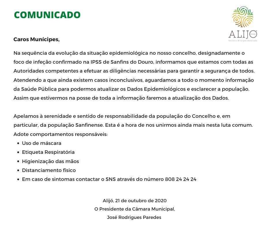 Na sequência da evolução da situação epidemiológica no nosso concelho, designadamente o foco de infeção confirmado na IPSS de Sanfins do Douro, informamos que estamos com todas as Autoridades competentes a efetuar as diligências necessárias para garantir a segurança de todos.