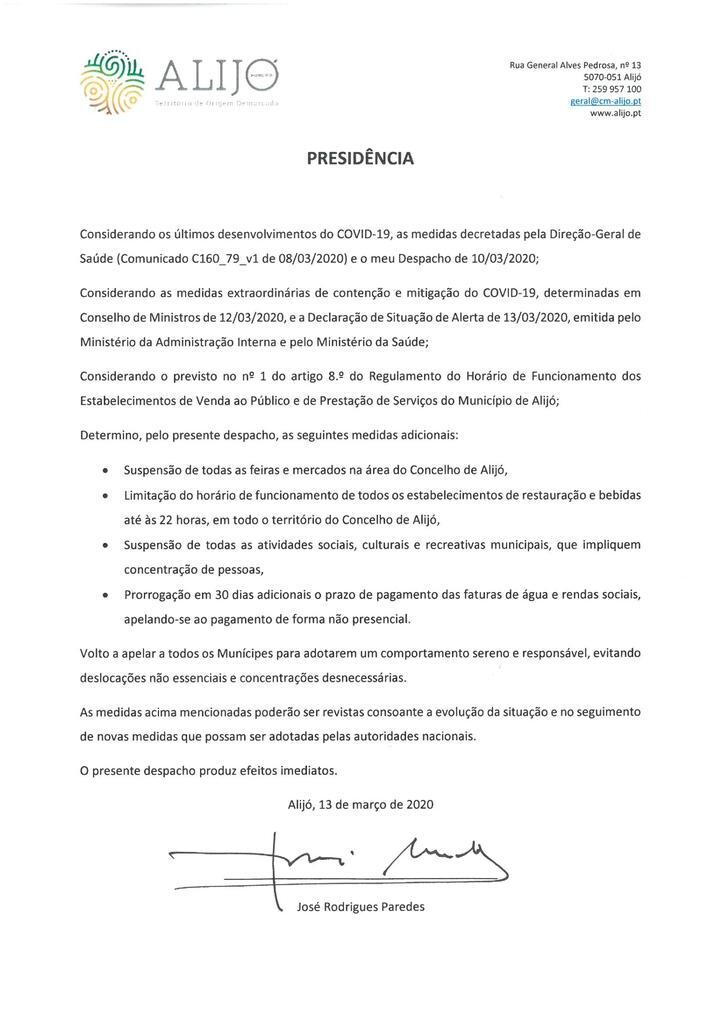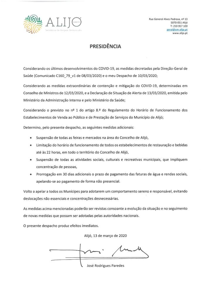 O Despacho da Presidência, de 13 de março, determina medidas adicionais, com efeitos imediatos, na sequência dos últimos desenvolvimentos da pandemia do novo Coronavírus (Covid-19).