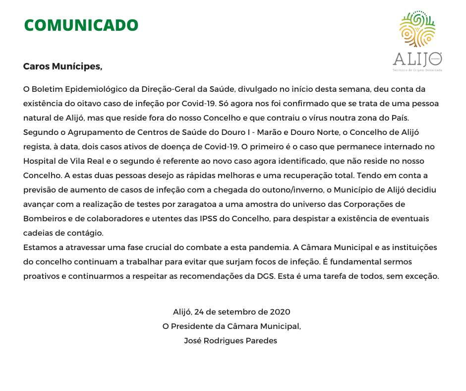 Segundo o Agrupamento de Centros de Saúde do Douro I - Marão e Douro Norte, o Concelho de Alijó regista, à data, dois casos ativos de doença de Covid-19. O primeiro é o caso que permanece internado no Hospital de Vila Real e o segundo é referente ao novo caso agora identificado, que não reside no nosso Concelho. A estas duas pessoas desejo as rápidas melhoras e uma recuperação total.