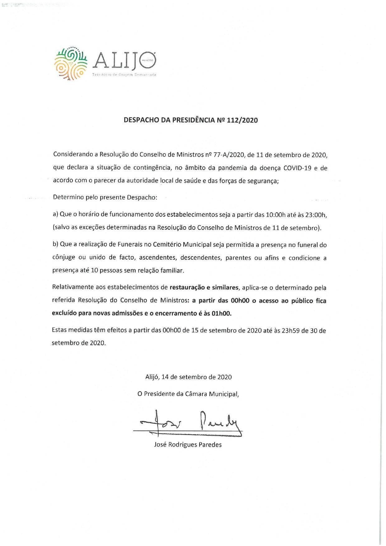O Despacho da Presidência, de 14 de setembro, determina novas medidas relativas a funerais e ao horário de funcionamento de estabelecimentos a partir de 15 de setembro, data em que o território nacional entra em situação de contingência, que se prolonga até 30 de setembro.