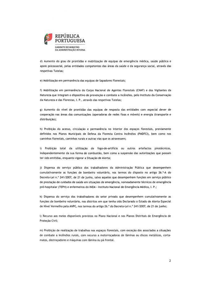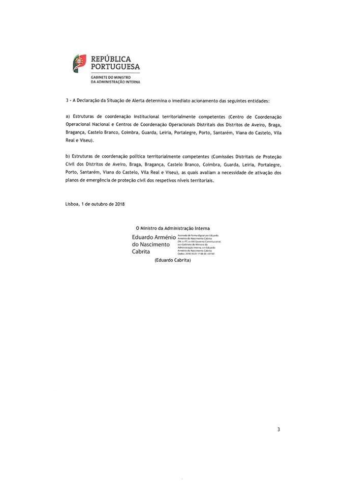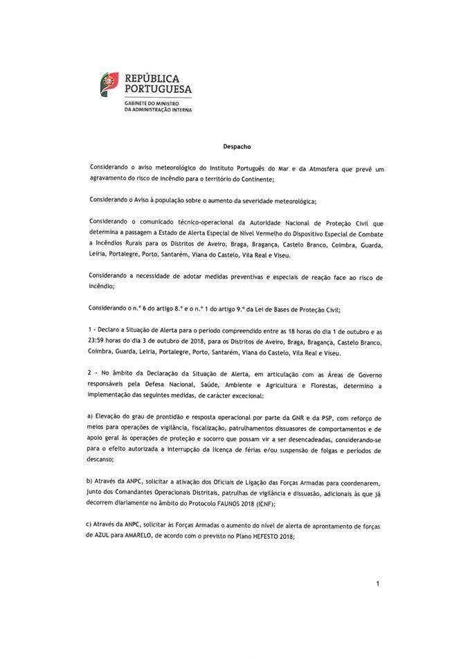 O SMPC informa, de acordo com Despacho do Gabinete do Ministro da Administração Interna, que no período compreendido entre as 18 horas do dia 1 de outubro e as 23:59 horas do dia 3 de outubro estamos no Estado de Alerta Especial Nível Vermelho. Durante este período todas as medidas restritivas estão apresentadas em despacho direto do Exmº Sr. Ministro da Administração Interna.