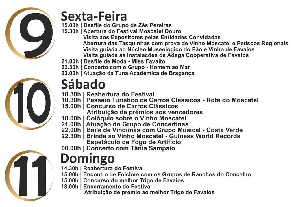 A tarde do dia 9 de outubro marca a abertura do Festival com uma Arruada de Zés Pereiras na Rua Direita de Favaios, seguida da Visita aos Expositores e Tasquinhas que se farão aí representar. Nesse mesmo dia propõe-se ainda o Concurso Miss Favaíto, que se traduzirá num Desfile de moda com atribuição de prémios às vencedoras. O dia 10 de Outubro é assumidamente o dia principal deste Festival e inicia-se com um convite para um Passeio/Concurso de Carros Clássicos, a que se seguirá um Colóquio sobre o Vinho Moscatel e o tradicional Baile de Vindimas. Já com o cair da noite chega o arrojado desafio “Brinde ao Vinho Moscatel” extensível a todos aqueles que se queiram juntar a esta iniciativa a contar para o Guiness World Records. No último dia do Festival, 11 de Outubro, de destacar um Encontro de Folclore com grupos de ranchos do concelho, que se desenrolará paralelamente ao Concurso que visa premiar o melhor Trigo de Favaios.