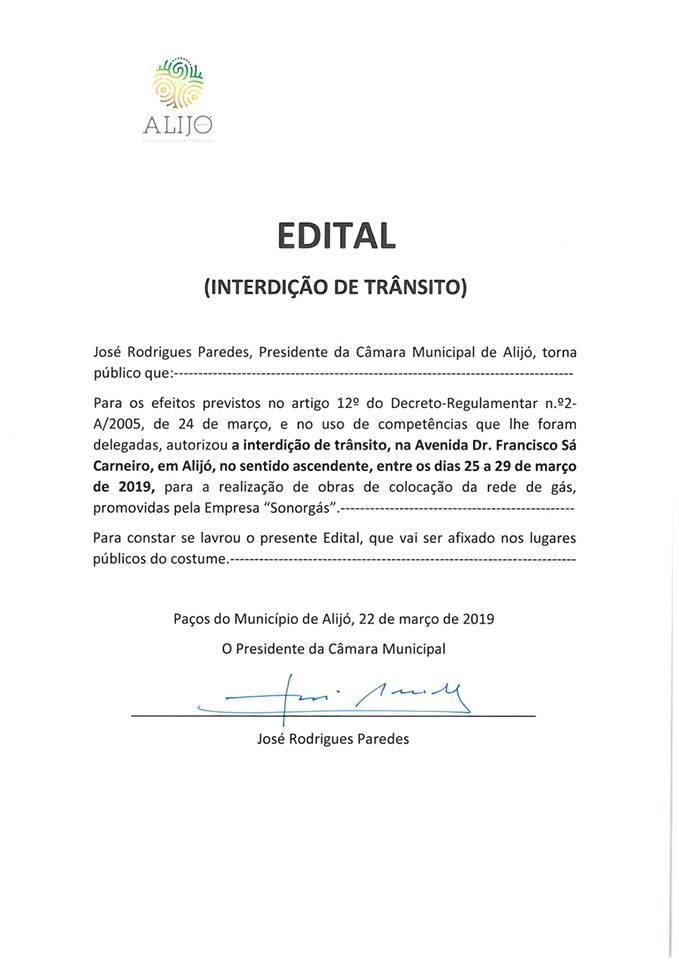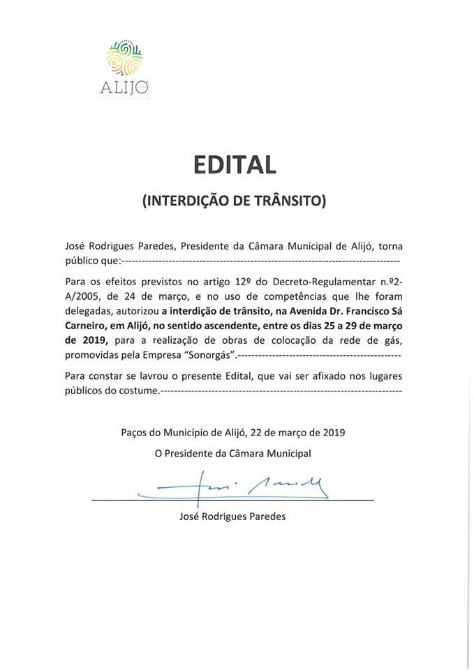 Interdição de Trânsito, na Avenida Dr. Francisco Sá Carneiro, em Alijó, no sentido ascendente, entre os dias 25 a 29 de março, para a realização de obras de colocação de rede de gás.