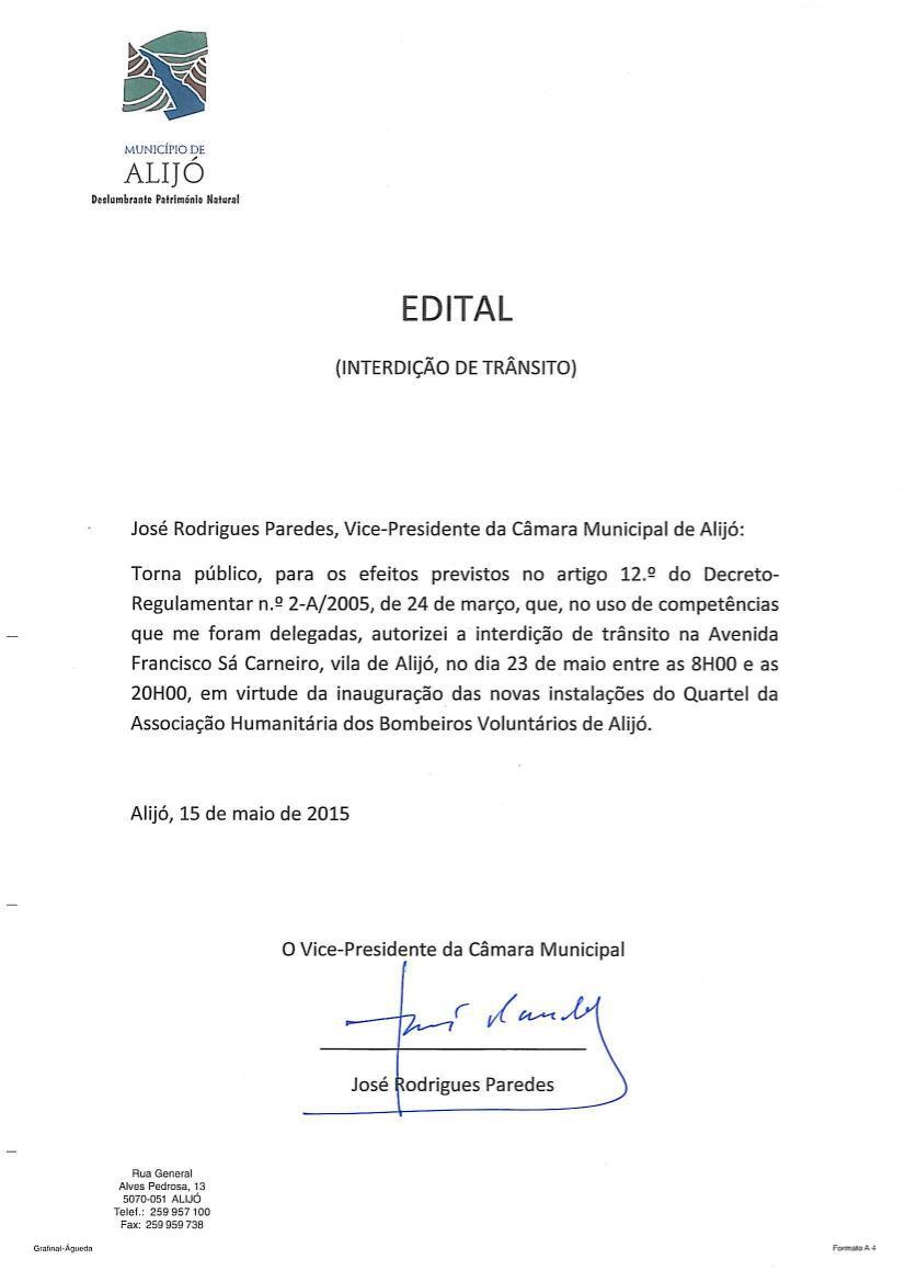 Dia 23 de maio, das 08.00h às 20.00h em virtude da inauguração do Quartel da Associação Humanitária dos Bombeiros Voluntários de Alijó.