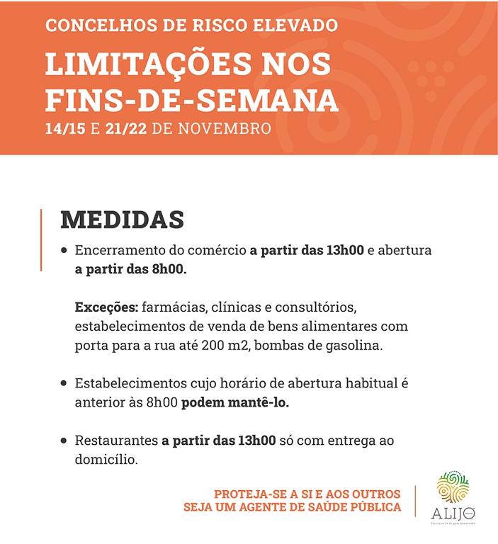 Tendo em conta as medidas especiais restritivas aplicadas aos concelhos do território nacional com risco elevado de contágio, foram impostas limitações nos fins-de-semana de 14 e 15 de novembro e de 21 e 22 de novembro.