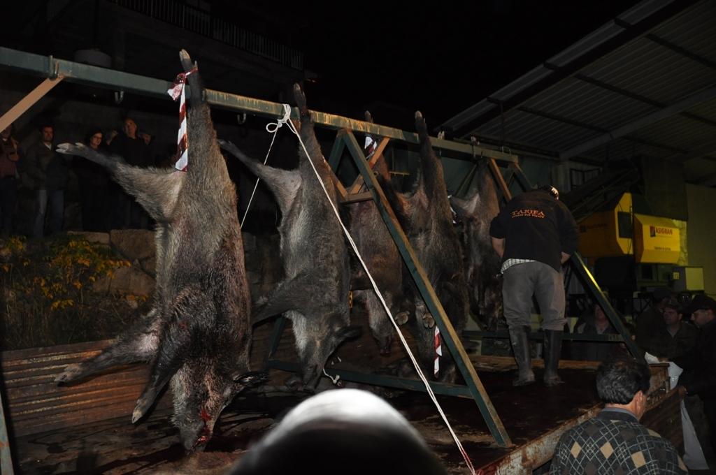 Após a distribuição dos respetivos monteiros pelas portas, as seis matilhas de cães “conduziram” os javalis em direção à mancha, tendo sido abatidos dez animais, com realce para um navalheiro com cerca de 150kg.