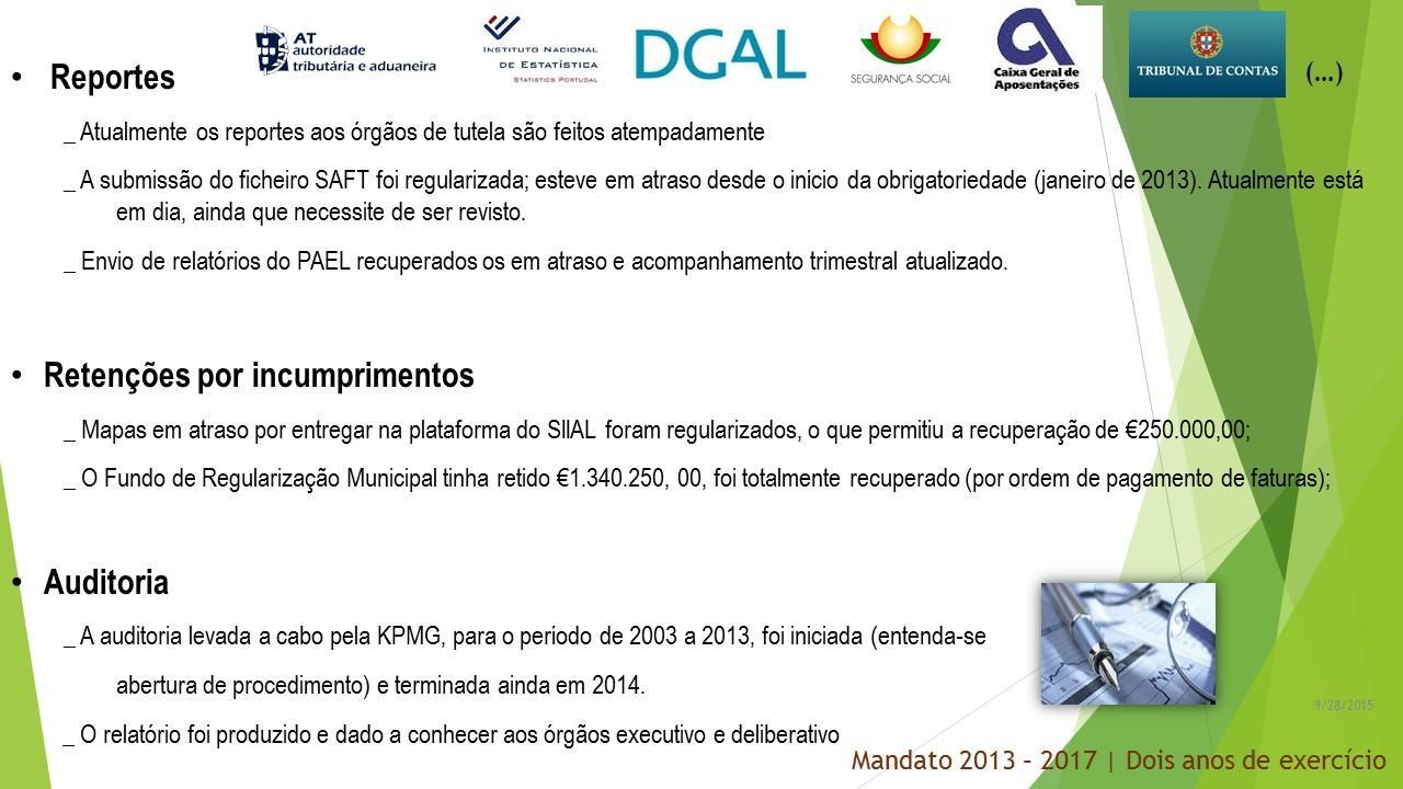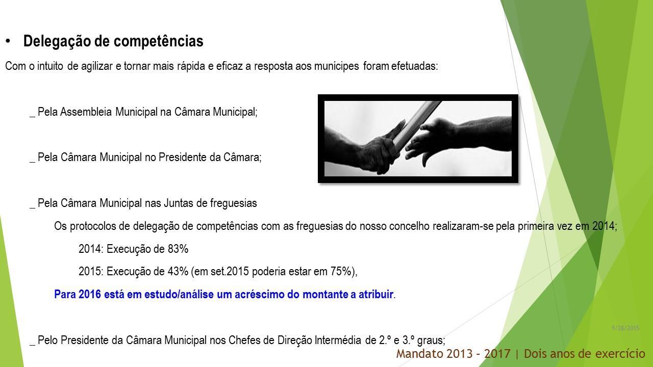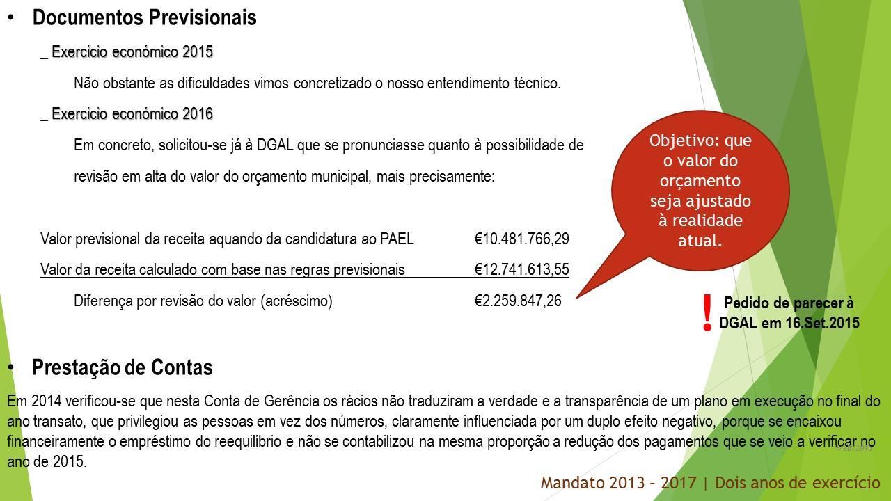 Dois anos depois, o orçamento para 2016, que está em fase final de preparação, é um documento rigoroso, adequado à realidade atual. Fizemos e projetámos investimento, consolidámos o passivo das finanças municipais, aumentámos a nossa autonomia financeira. São, hoje, bem visíveis os resultados da eficiente e rigorosa administração municipal que levámos a cabo ao longo destes dois anos. O orçamento para 2016 será um documento sério e transparente que reflete, sem subterfúgios, a realidade municipal.