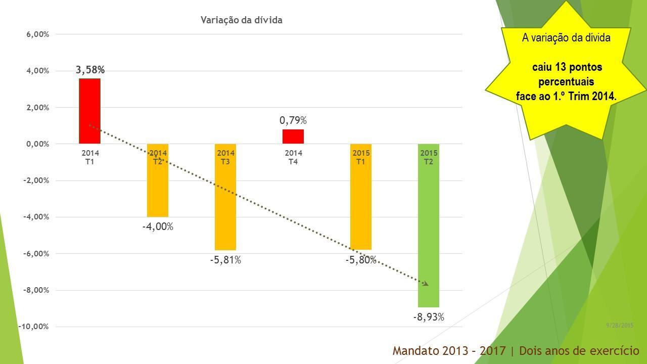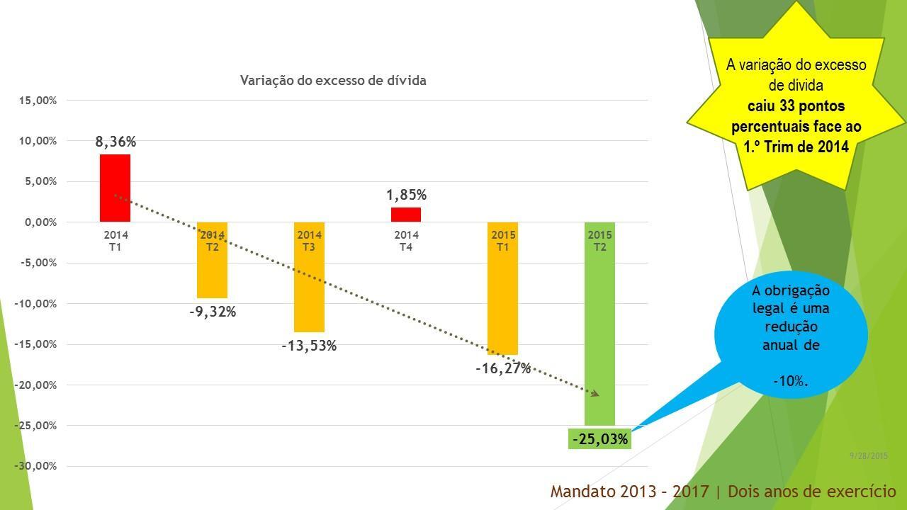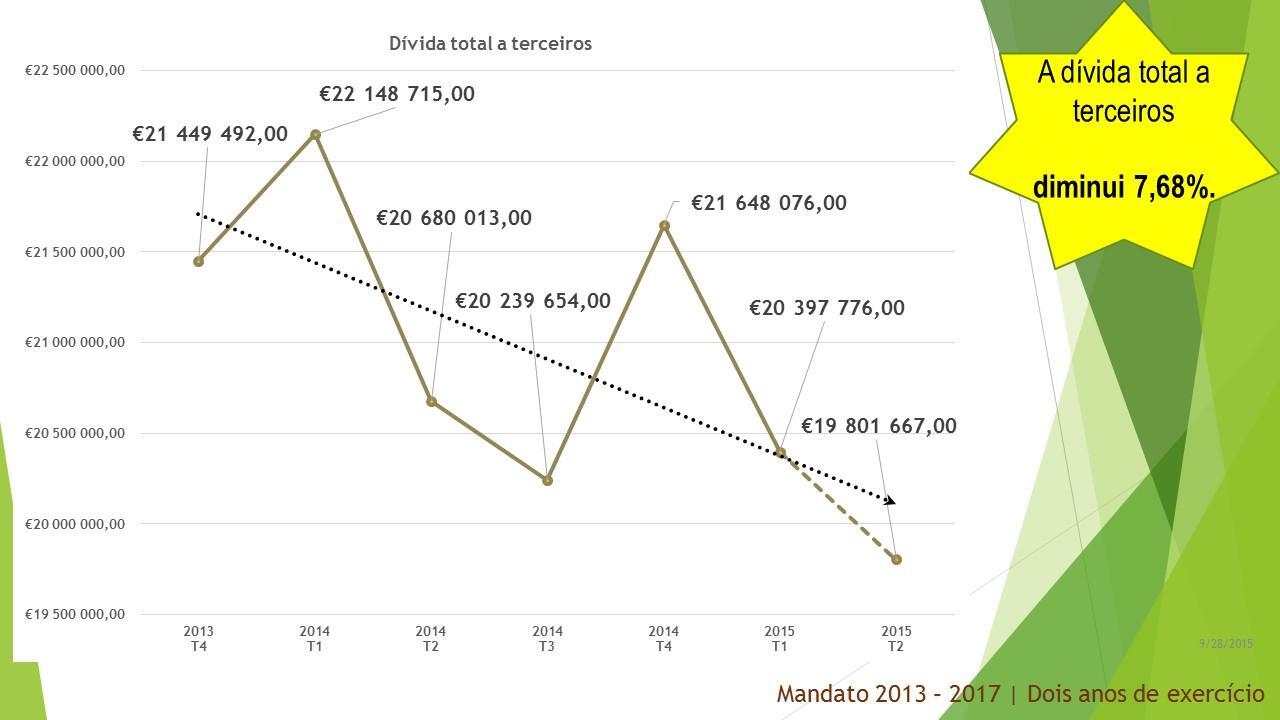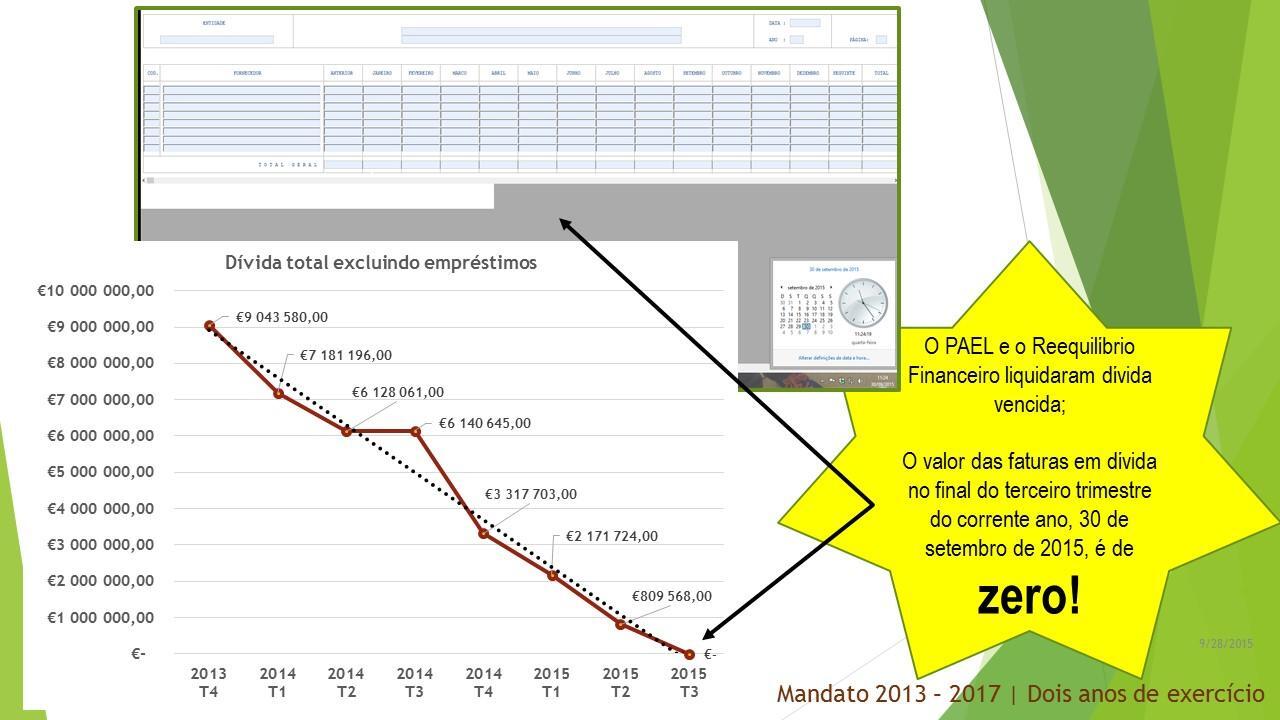 Para estes dois anos que agora terminam prometemos, também, executar com transparência e rigor o Programa de Reequilíbrio Financeiro e o Programa de Apoio à Economia Local. Ambos os programas foram, por nós, reformulados e renegociados pois não tinham sustentabilidade temporal e foram levados a bom porto com reflexo muito positivo na saúde das finanças municipais. Vejamos: O prazo médio de pagamento reduziu 69,20 %; a dívida total a terceiros diminuiu 7,68 %; o montante de dívida em excesso diminuiu 37,17 %; a variação da dívida caiu 13 pontos percentuais face ao 1.º trimestre de 2014; a variação do excesso de dívida caiu 33 pontos percentuais face ao 1.º trimestre de 2014. A boa execução do Reequilíbrio Financeiro e do Programa de Apoio à Economia Local liquidaram a dívida vencida e o valor das faturas em dívida no final do terceiro trimestre do corrente ano, 30 de setembro de 2015, é de ZERO!