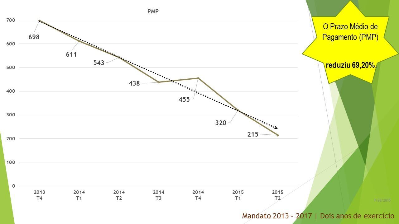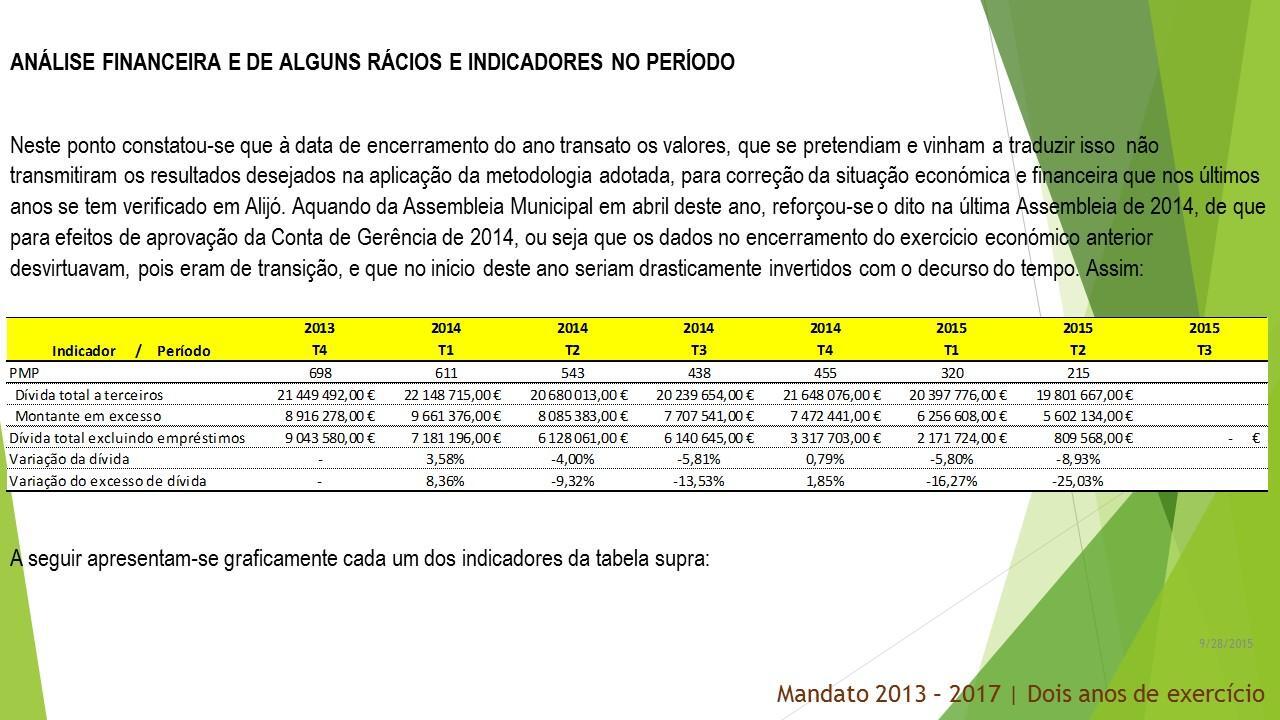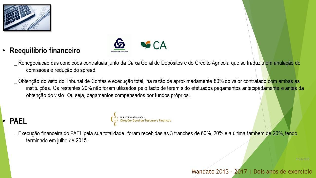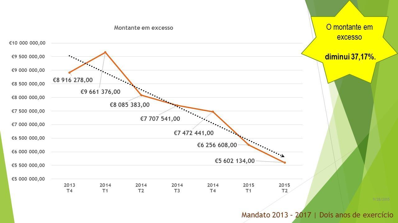 Para estes dois anos que agora terminam prometemos, também, executar com transparência e rigor o Programa de Reequilíbrio Financeiro e o Programa de Apoio à Economia Local. Ambos os programas foram, por nós, reformulados e renegociados pois não tinham sustentabilidade temporal e foram levados a bom porto com reflexo muito positivo na saúde das finanças municipais. Vejamos: O prazo médio de pagamento reduziu 69,20 %; a dívida total a terceiros diminuiu 7,68 %; o montante de dívida em excesso diminuiu 37,17 %; a variação da dívida caiu 13 pontos percentuais face ao 1.º trimestre de 2014; a variação do excesso de dívida caiu 33 pontos percentuais face ao 1.º trimestre de 2014. A boa execução do Reequilíbrio Financeiro e do Programa de Apoio à Economia Local liquidaram a dívida vencida e o valor das faturas em dívida no final do terceiro trimestre do corrente ano, 30 de setembro de 2015, é de ZERO!