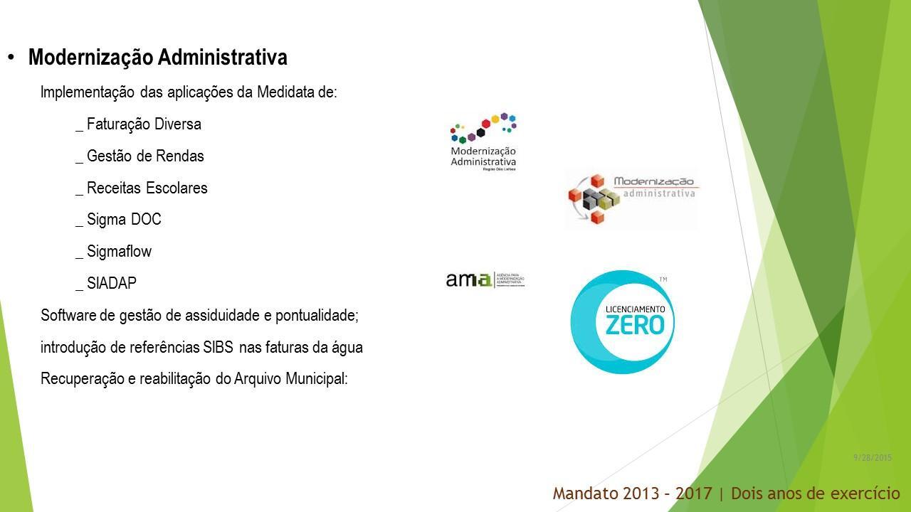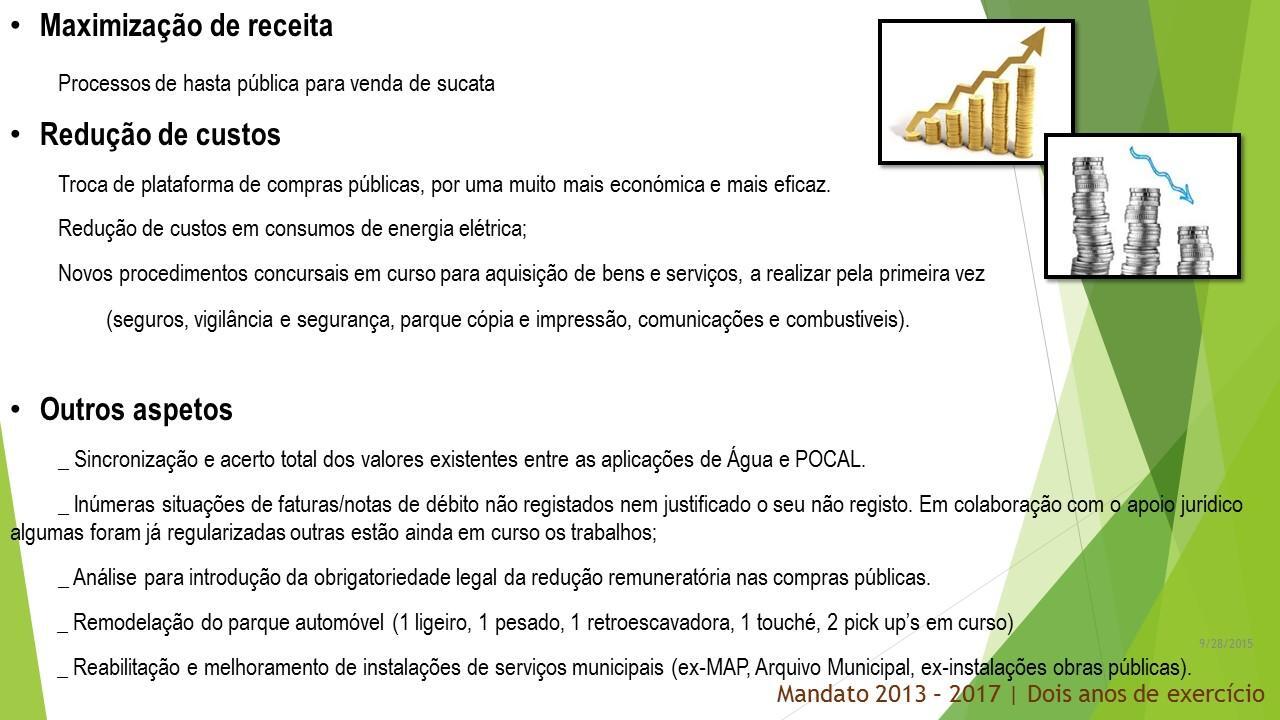 Não obstante termos levado a cabo, com sucesso, a gigantesca tarefa de, em dois anos, colocar as finanças municipais em ordem – trabalho que não é visível no dia-a-dia dos munícipes mas é fundamental para a retoma económica e credibilidade do Município - com os parcos fundos disponíveis prestámos serviços de qualidade que potenciam o desenvolvimento sustentado e sustentável do concelho. Foi assim na área do ambiente, das infraestruturas públicas, no domínio do social, na educação, na cultura… É verdade que ainda não estamos a fazer tanto quanto gostaríamos de fazer mas não é menos verdade que estamos, paulatinamente, a implementar um novo paradigma de desenvolvimento: aproveitar e valorizar todas as potencialidades do nosso Concelho.