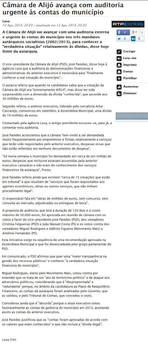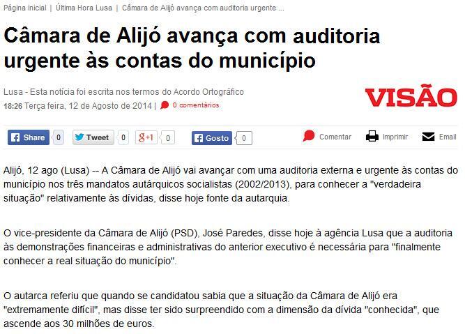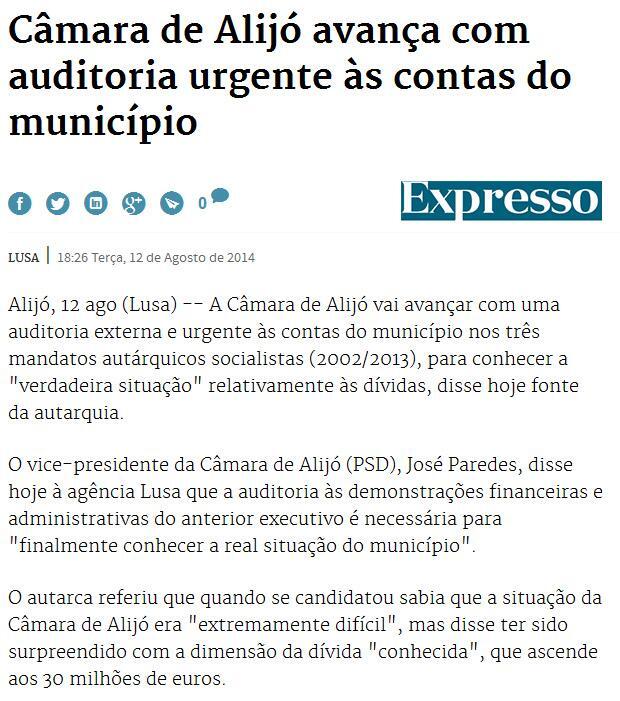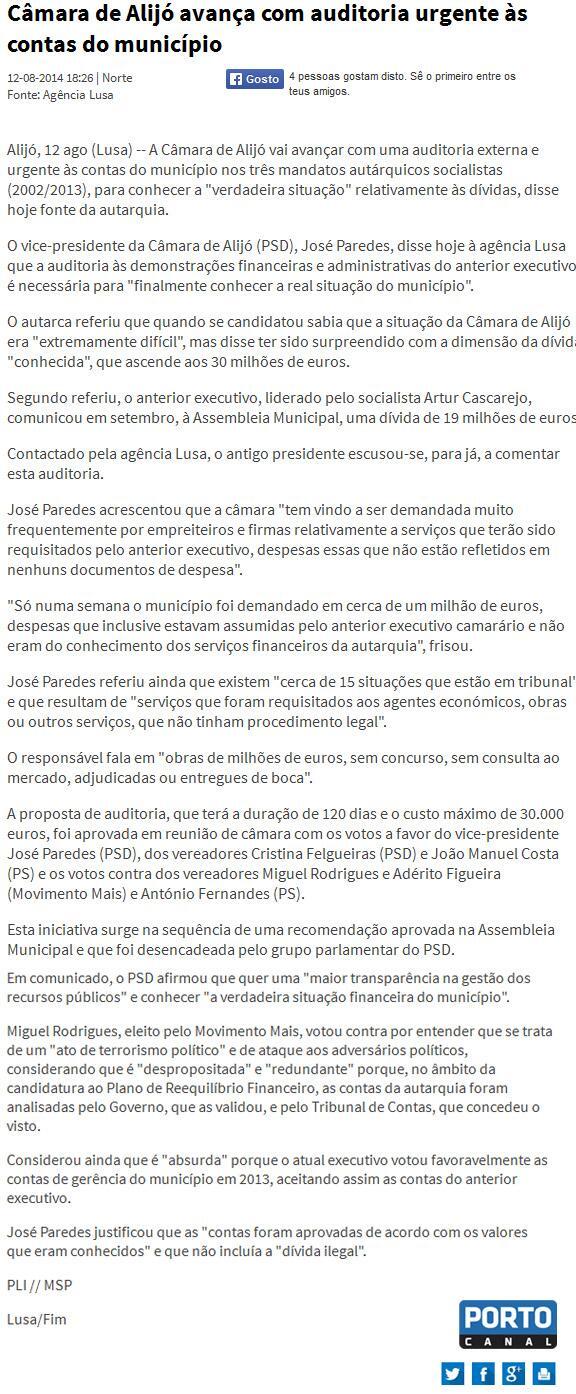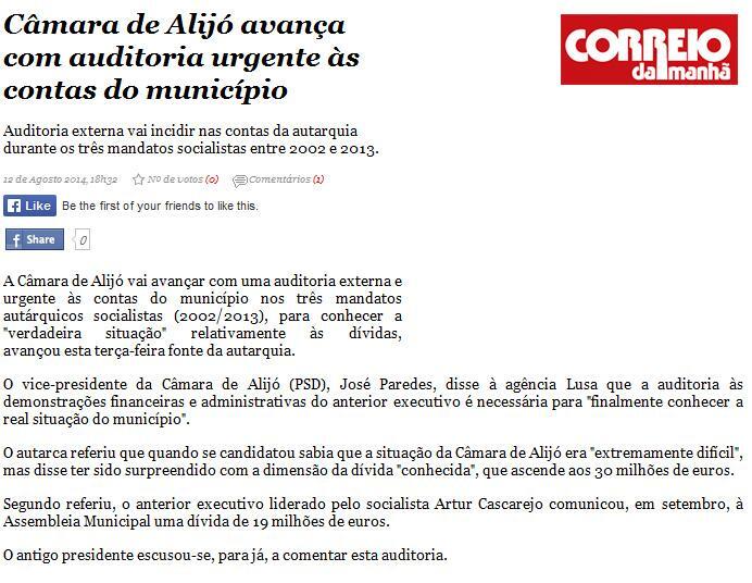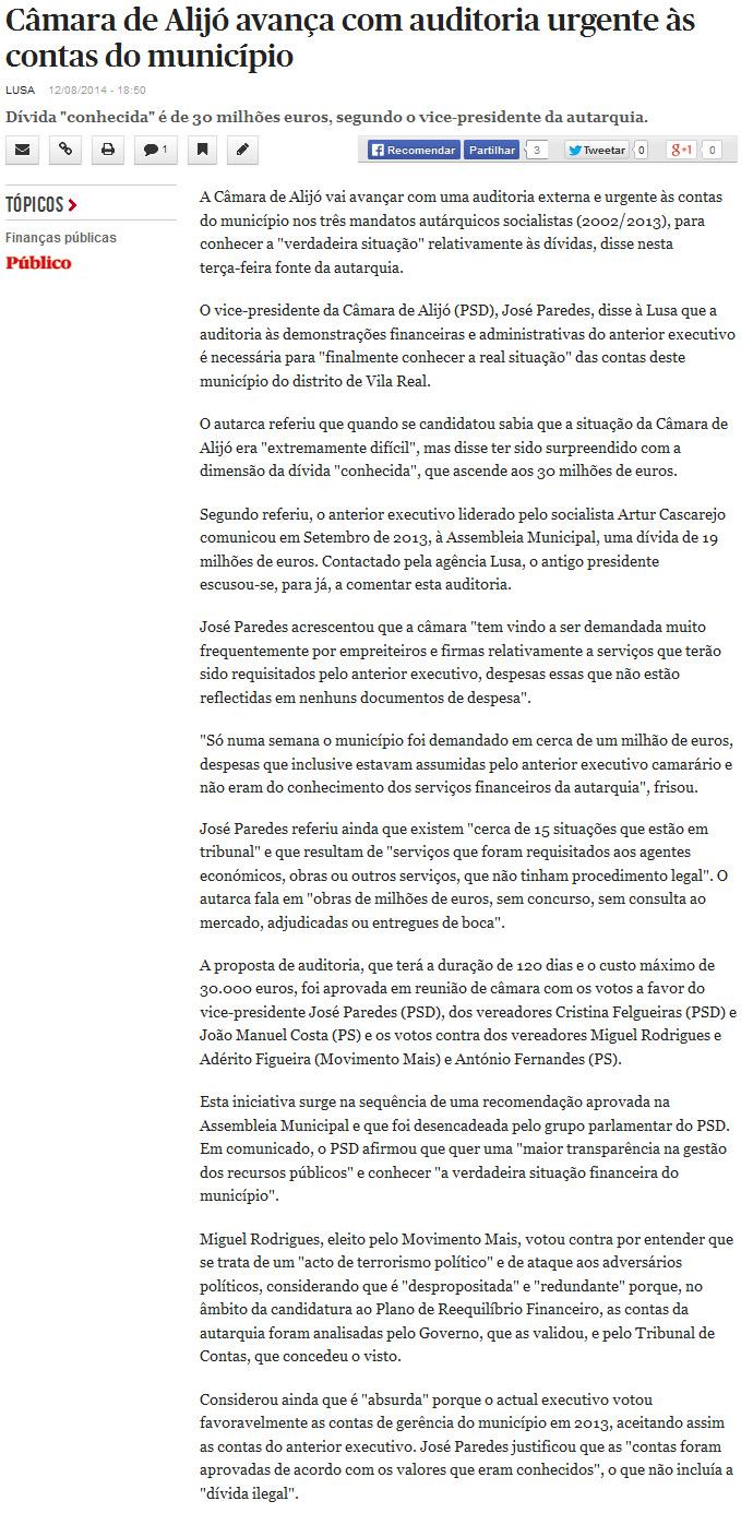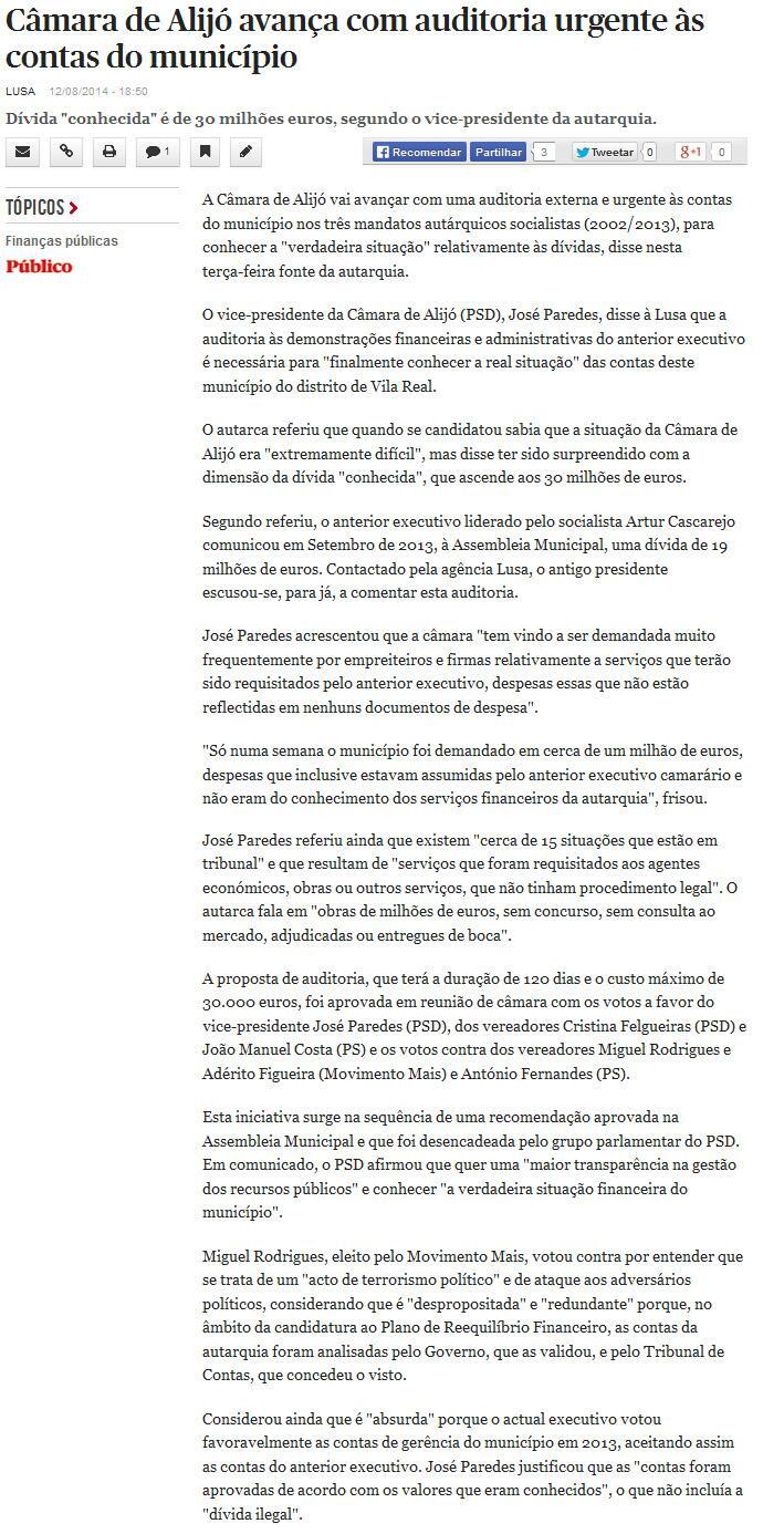 A Auditoria Externa aos 3 últimos mandatos autárquicos, aprovada em Reunião de Câmara do atual Executivo, merece destaque na Imprensa Nacional desta quarta-feira, dia 13/08/2014.