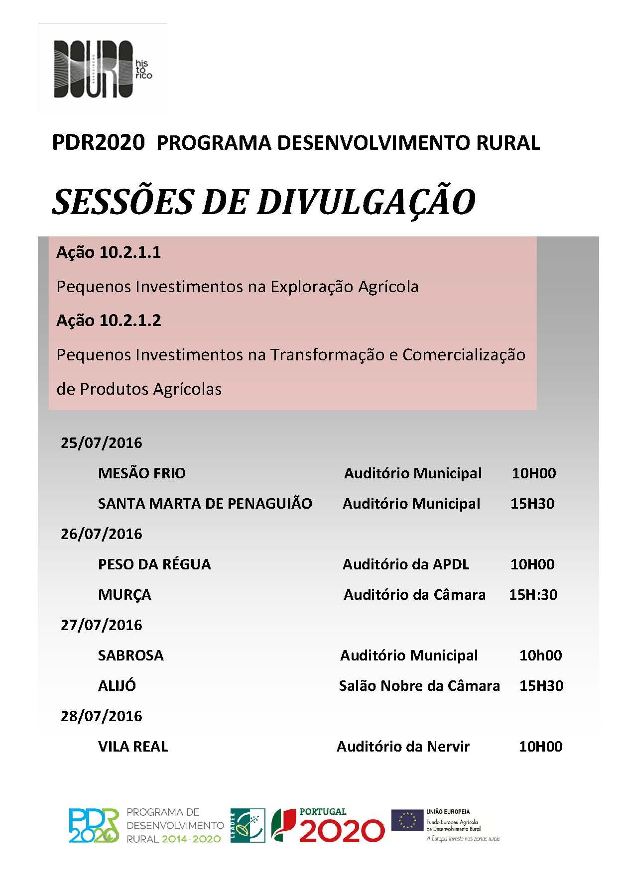 O Município de Alijó, no âmbito do plano de ação de divulgação/esclarecimento dos munícipes deste Concelho e em parceria com a Associação do Douro Histórico, Grupo de Ação Local, responsável pela gestão e acompanhamento do LEADER/DLBC, informa que o Programa de Desenvolvimento Rural 2014-2020 abriu no passado dia 21 de Julho as seguintes Ações: - Ação 10.2.1.1. Pequenos investimentos na exploração agrícola; - Ação 10.2.1.2. Pequenos investimento na transformação e comercialização de produtos agrícolas; Mais se informa que decorrerá uma sessão de divulgação/esclarecimento das ações referidas, no dia 27 de julho, pelas 15:30h, no salão Nobre do Município de Alijó, coordenada pela Associação do Douro Histórico em parceria com o Município de Alijó.