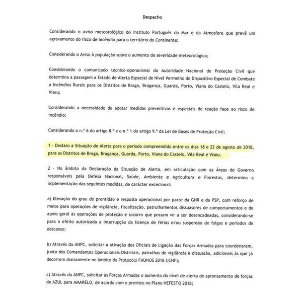 Estado de Alerta Especial de Nível Vermelho - 18 a 22 de agosto 2018 - Despacho do Gabinete Ministro da Administração Interna