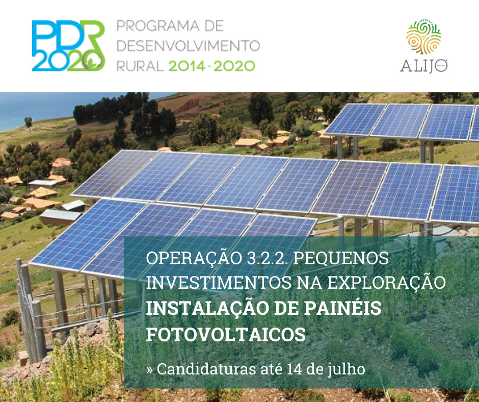 O Município de Alijó informa que se encontram abertam, até ao dia 14 de julho, as candidaturas à linha de apoio “Operação 3.2.2. Pequenos Investimentos na Exploração: Instalação de Painéis Fotovoltaicos - Next Generation”, com incentivos não reembolsáveis até 70%.