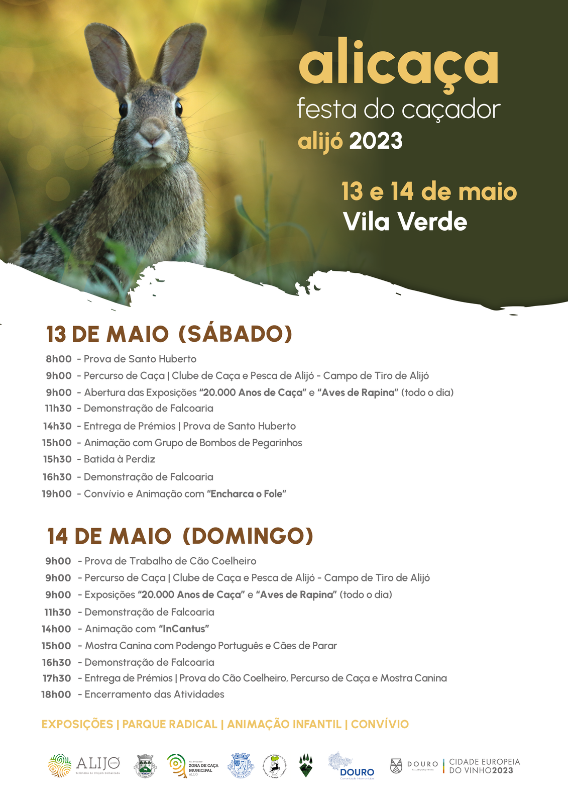 Nos dois dias, o programa de atividades inclui um Percurso de Caça, com o apoio do Clube de Caça e Pesca de Alijó, que começa às 9h00, no Campo de Tiro, em Alijó. Durante todo o evento, os visitantes poderão ainda ver as Exposições “20.000 Anos de Caça” e “Aves de Rapina”, assim como assistir a várias demonstrações de falcoaria, no período da manhã e da tarde.