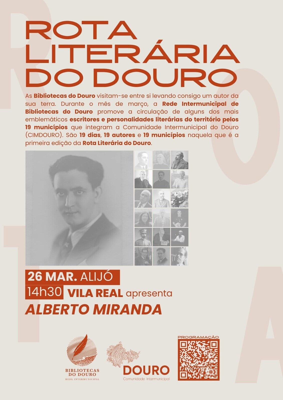 A 26 de março, será a vez da Biblioteca Municipal de Alijó receber Vila Real com uma apresentação dedicada ao poeta Alberto Miranda. A Rota Literária do Douro é um projeto cultural que pretende divulgar os autores locais para além dos seus concelhos de origem, promovendo a sua circulação pelas bibliotecas da região.