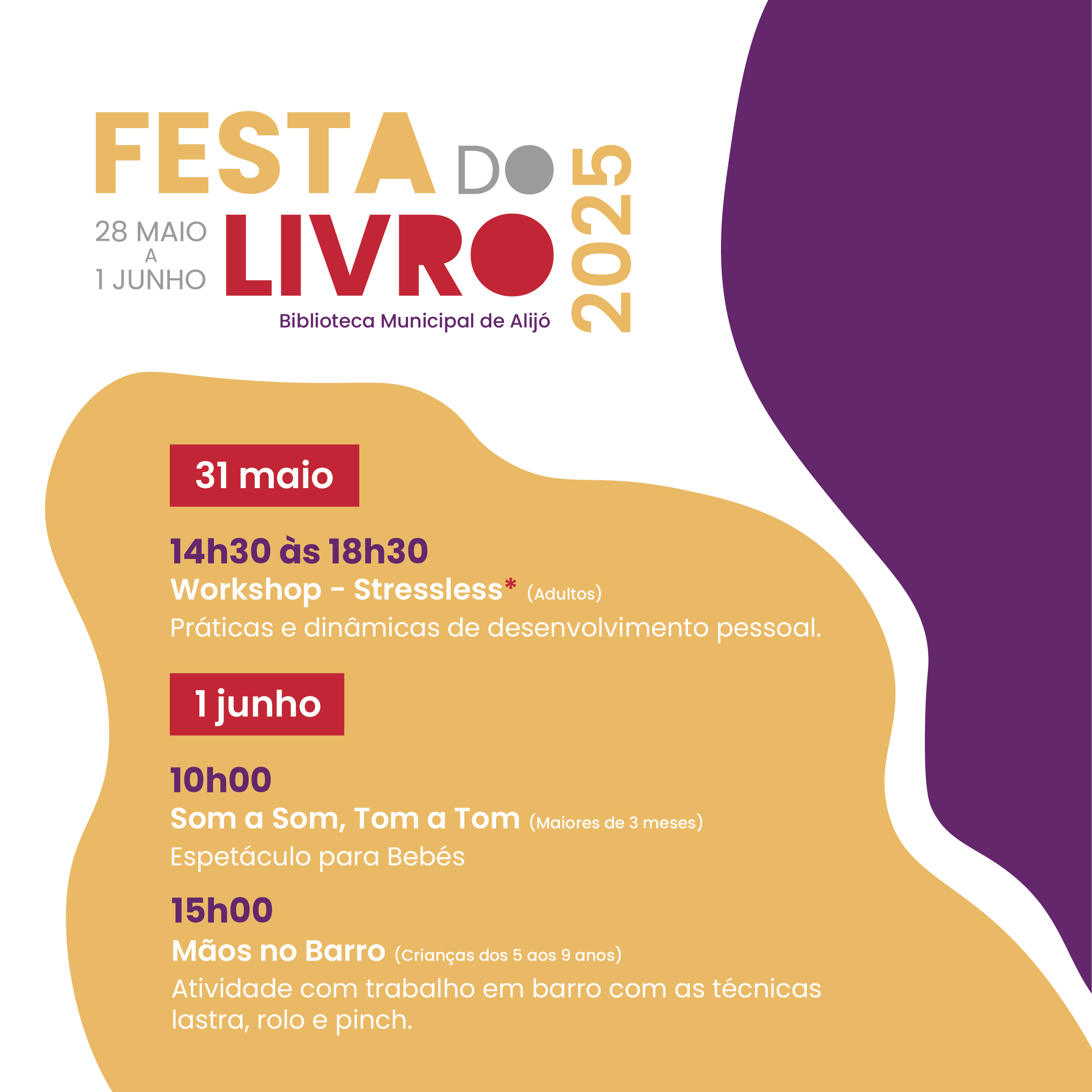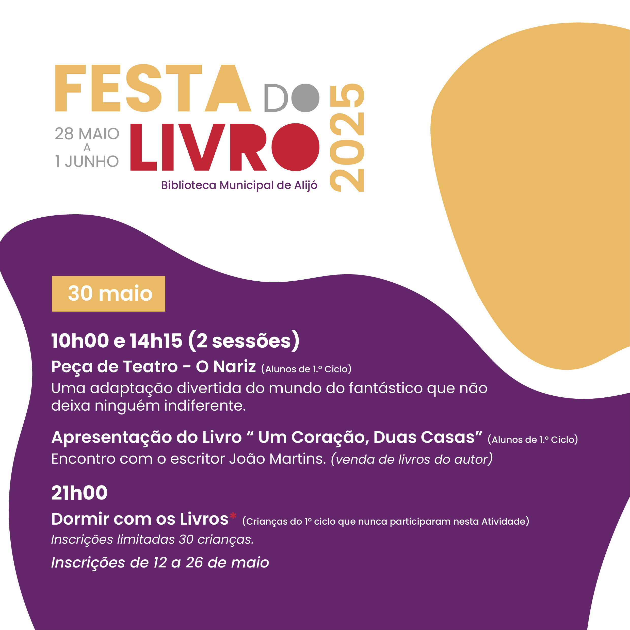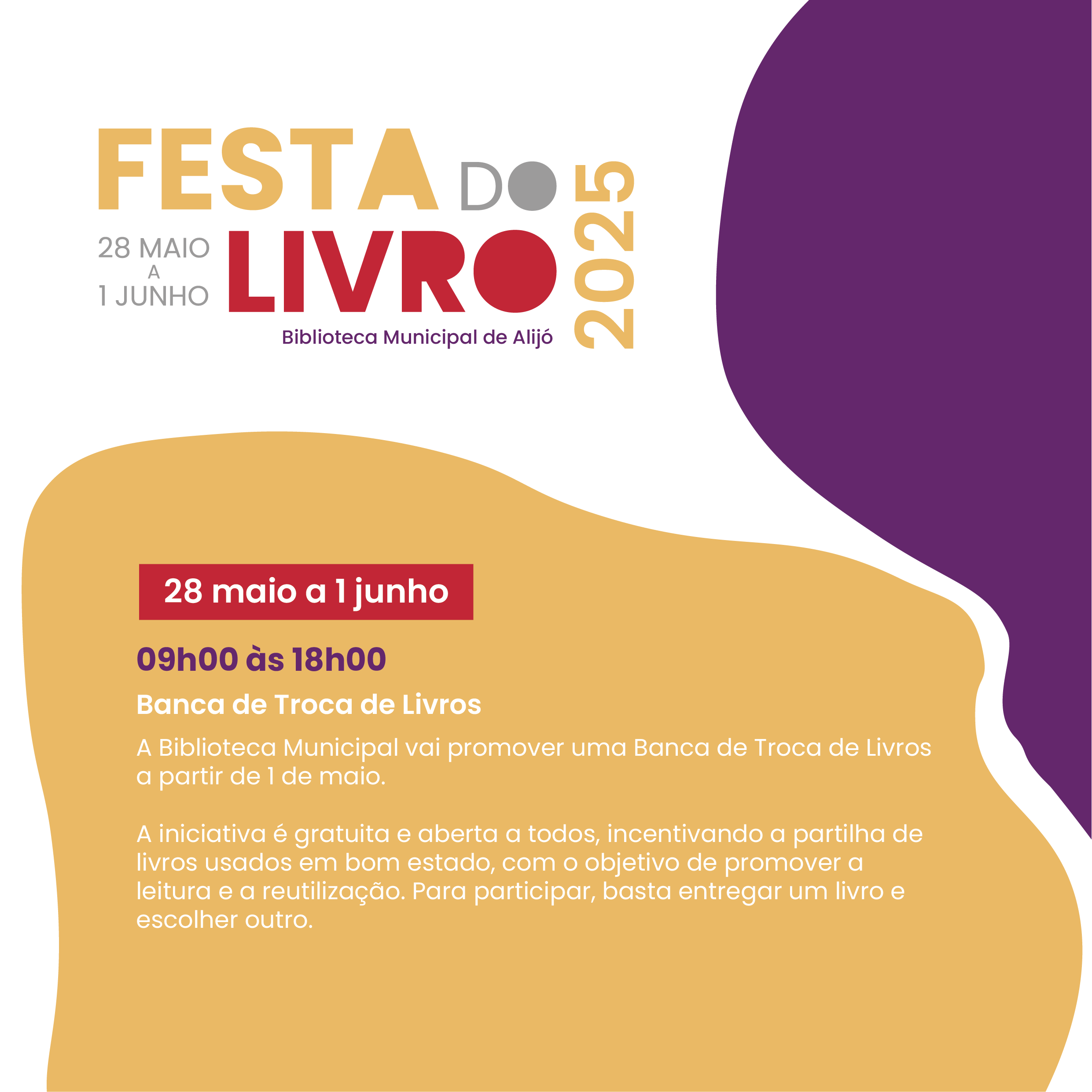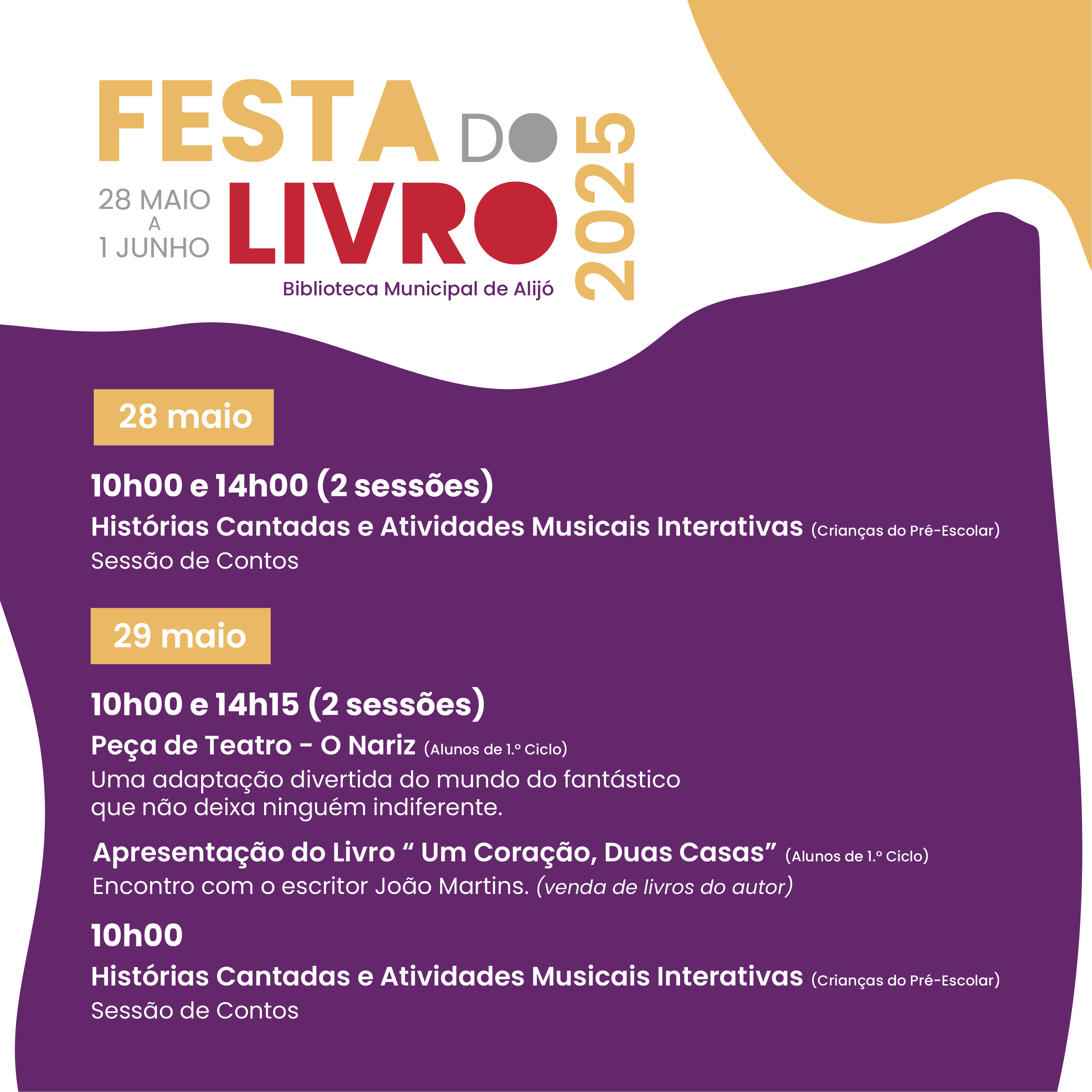 A Biblioteca Municipal de Alijó volta a encher-se de histórias com a Festa do Livro, de 28 de maio a 01 de junho. Com um programa pensado para todas as idades, esta iniciativa convida a comunidade a viver os livros, descobrir autores e redescobrir a Biblioteca enquanto espaço de encontro, imaginação e partilha.