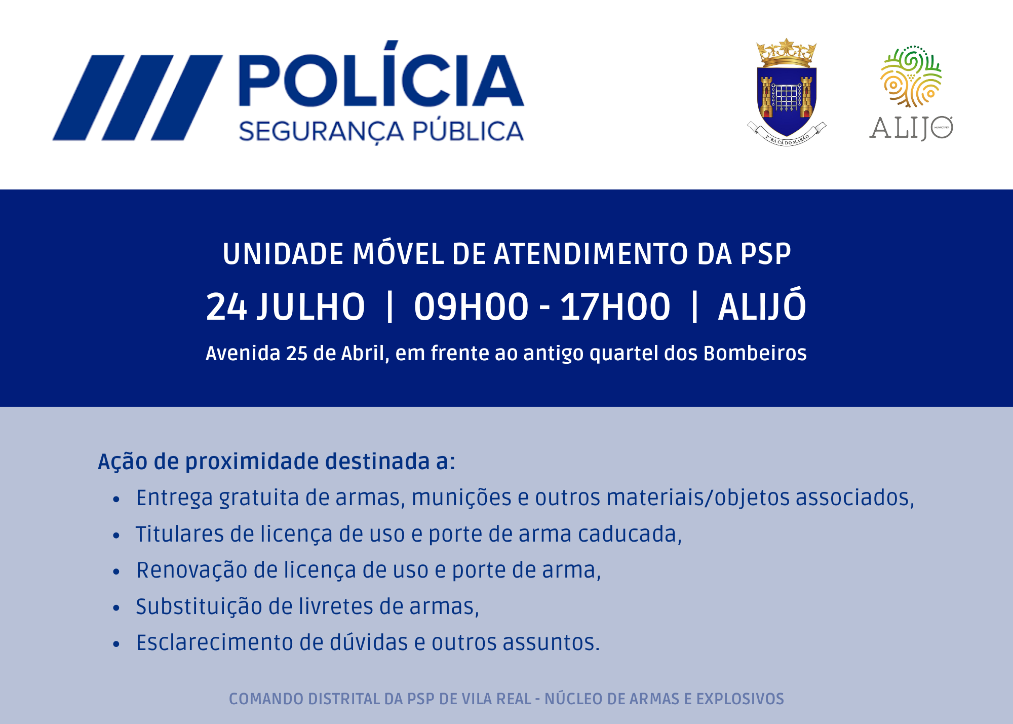 Esta ação de proximidade é destinada a entrega gratuita de armas, munições e outros materiais/objetos associados; titulares de licença de uso e porte de arma caducada; renovação de licença de uso e porte de arma; substituição de livretes de armas; e esclarecimento de dúvidas e outros assuntos.