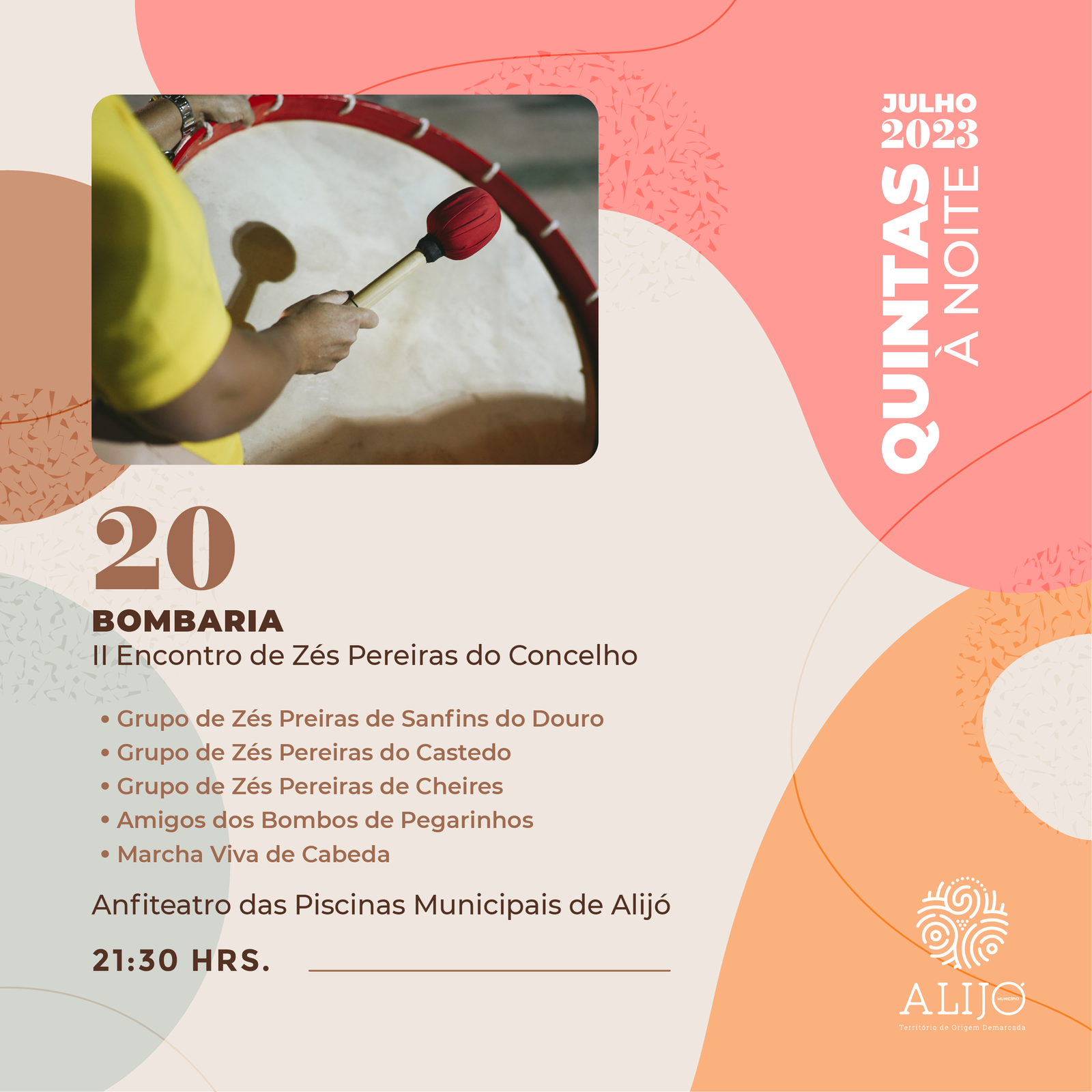 A Bombaria - II Encontro de Zés Pereiras do Concelho de Alijó é o próximo espetáculo das “Quintas à Noite”, que vai animar o Anfiteatro das Piscinas Municipais de Alijó, a 20 de julho, a partir das 21h30. Estarão presentes o Grupo de Zés Preiras de Sanfins do Douro, o Grupo de Zés Pereiras do Castedo, o Grupo de Zés Pereiras de Cheires, os Amigos dos Bombos de Pegarinhos e a Marcha Viva de Cabeda.