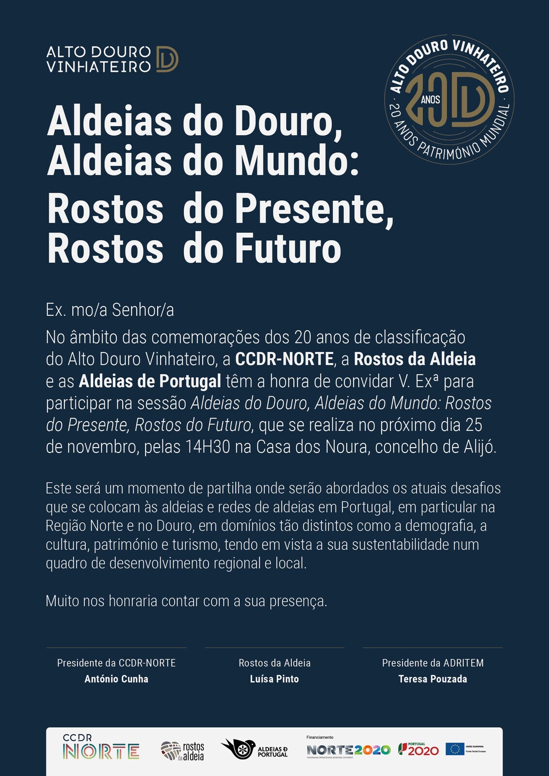 A Casa dos Noura, em Alijó, será o palco do encontro “Aldeias do Douro, Aldeias do Mundo: Rostos do Presente, Rostos do Futuro”, que se realiza a 25 de novembro, a partir das 14h30. O evento, inserido no âmbito das comemorações dos 20 anos de classificação do Alto Douro Vinhateiro, é promovido em parceria pela CCDR-NORTE, a Aldeias de Portugal e a Rostos da Aldeia.