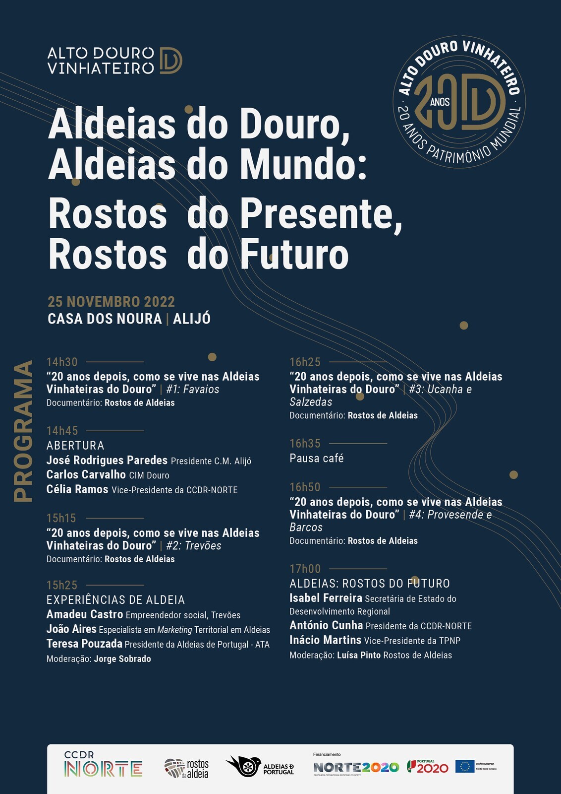 Nesta ocasião, serão apresentados quatro filmes documentais relativos a diversas Aldeias Vinhateiras do Douro (Ucanha e Salzedas, Favaios, Trevões e Provesende), produzidos nos últimos meses pela associação cultural “Rostos da Aldeia”. As atividades incluem ainda três painéis de debate.