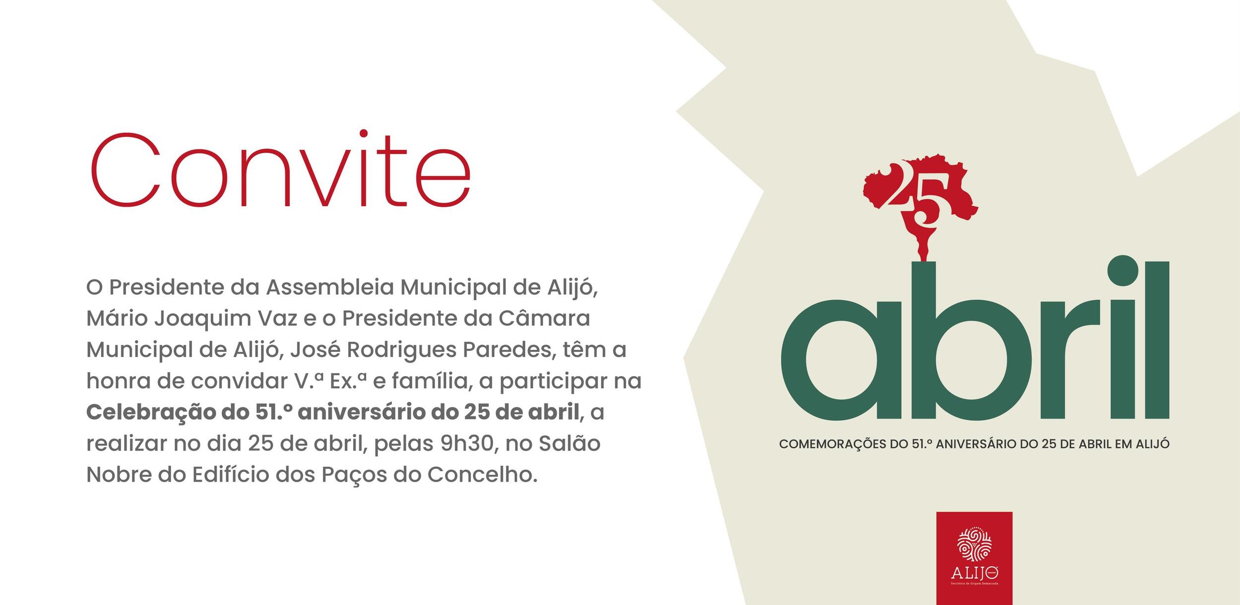 A Sessão Solene do 51º Aniversário da Revolução de 25 de abril terá lugar no Salão Nobre dos Paços do Concelho, a partir das 10h30, com intervenções do Presidente da Assembleia Municipal, do Presidente da Câmara Municipal e das forças políticas com representação na Assembleia Municipal de Alijó.
