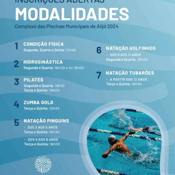 O Município de Alijó informa que estão abertas, a partir de hoje, dia 16 de setembro, as inscrições para as modalidades de Hidroginástica, Pilates, Zumba Gold, Condição Física, Natação Pinguins ...15 de Setembro de 2024 -