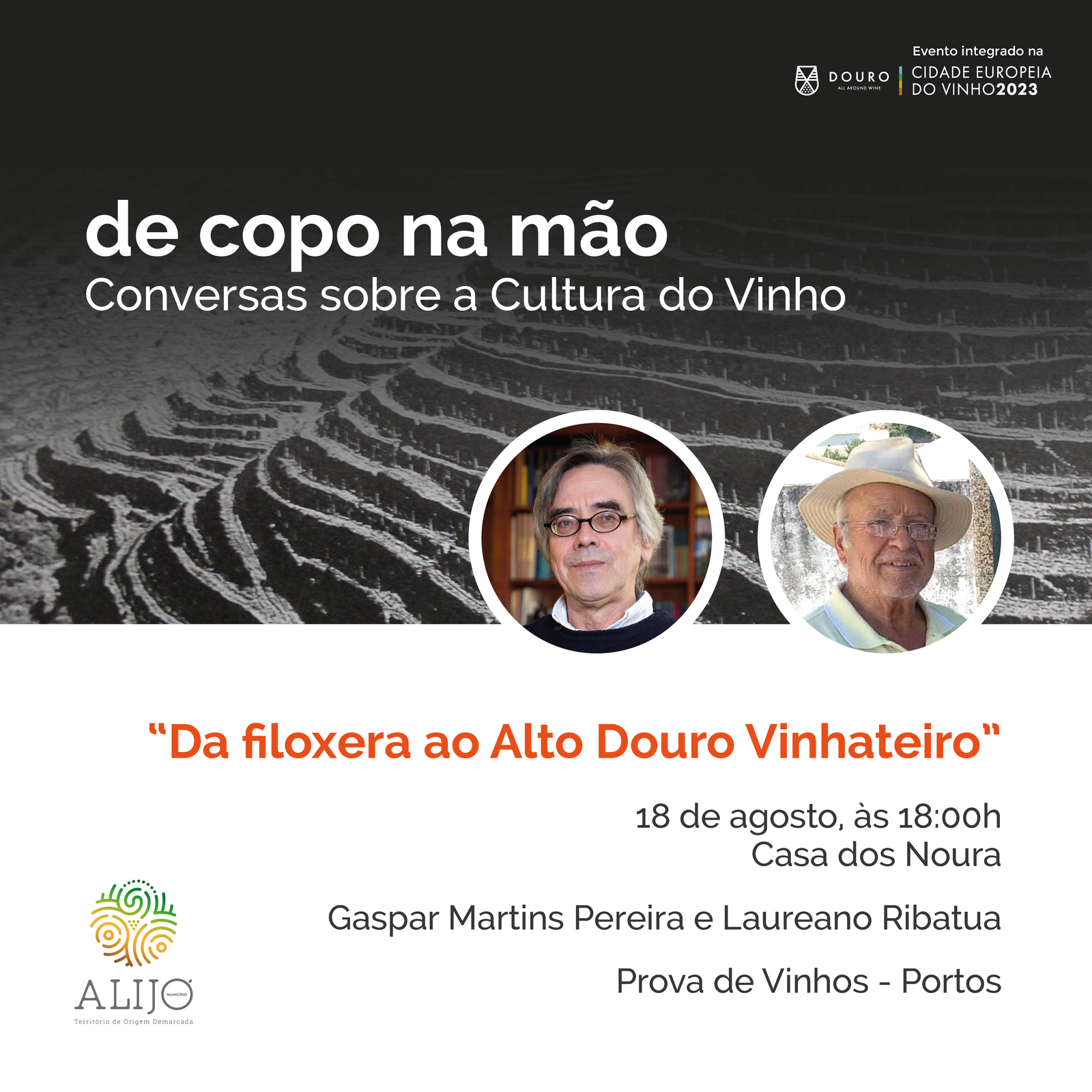 O Município de Alijó vai promover a quarta conversa do ciclo “De Copo na Mão”, dedicada ao tema “Da filoxera ao Alto Douro Vinhateiro”, que conta com a participação do Professor Escultor Laureano Ribatua e do Professor Gaspar Martins Pereira. A Casa dos Noura será o palco desta Conversa, que terá lugar esta sexta-feira, 18 de agosto, às 18h00. A iniciativa inclui uma prova de vinho do Porto.