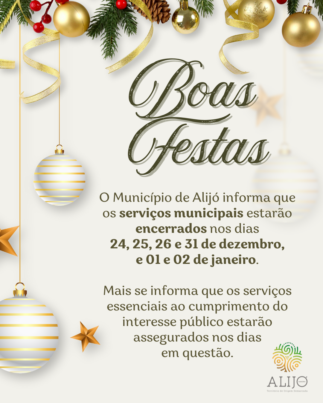 O Município de Alijó informa que os serviços municipais estarão encerrados nos próximos dias 24, 25, 26 e 31 de dezembro, e ainda 01 e 02 de janeiro.