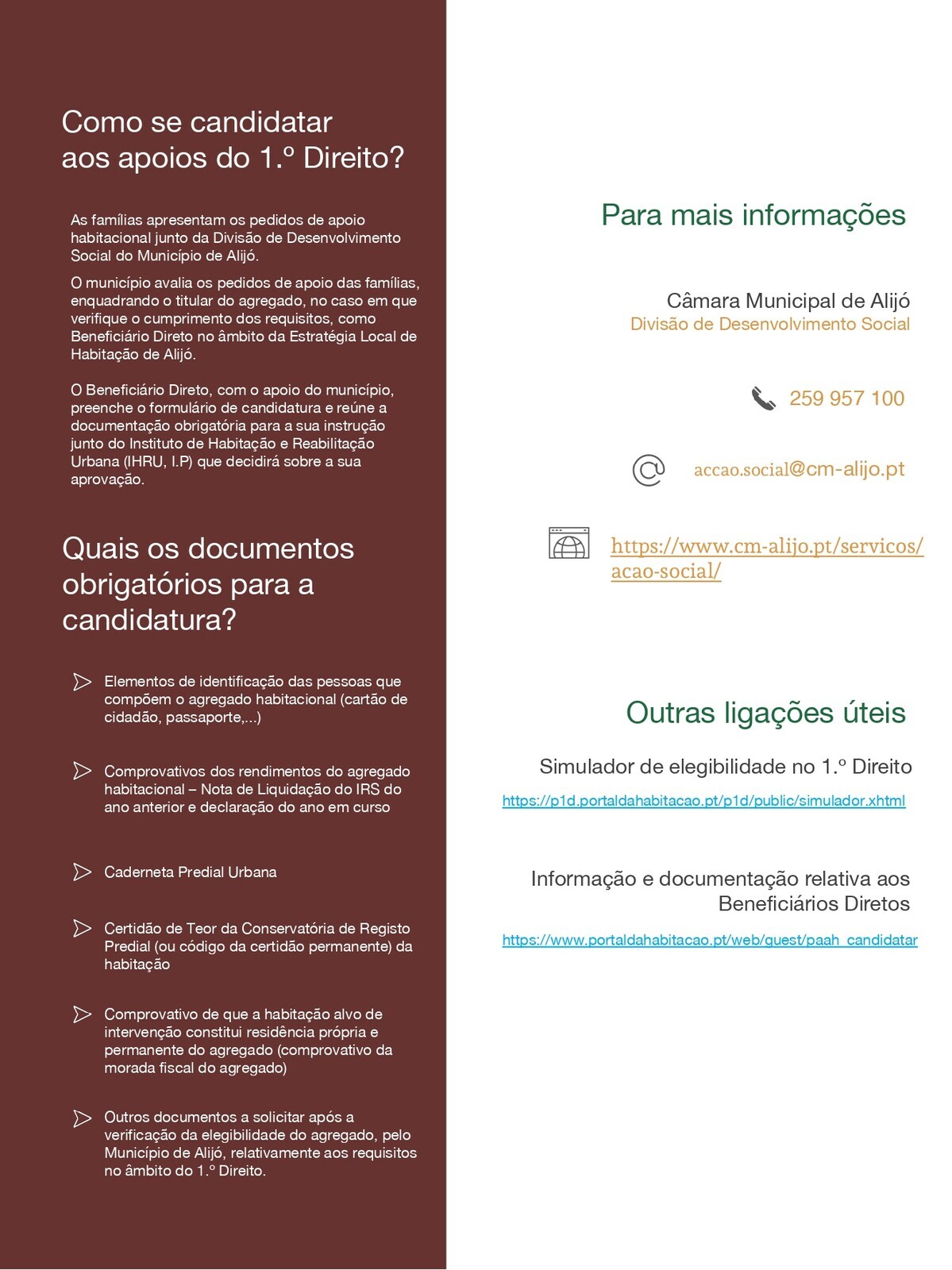 Caso se encontre nesta situação e pretende beneficiar deste apoio, deverá dirigir-se ao Serviço de Ação Social do Município de Alijó, entre 2 e 25 de novembro, de modo a avaliar se é elegível para elaborar candidatura