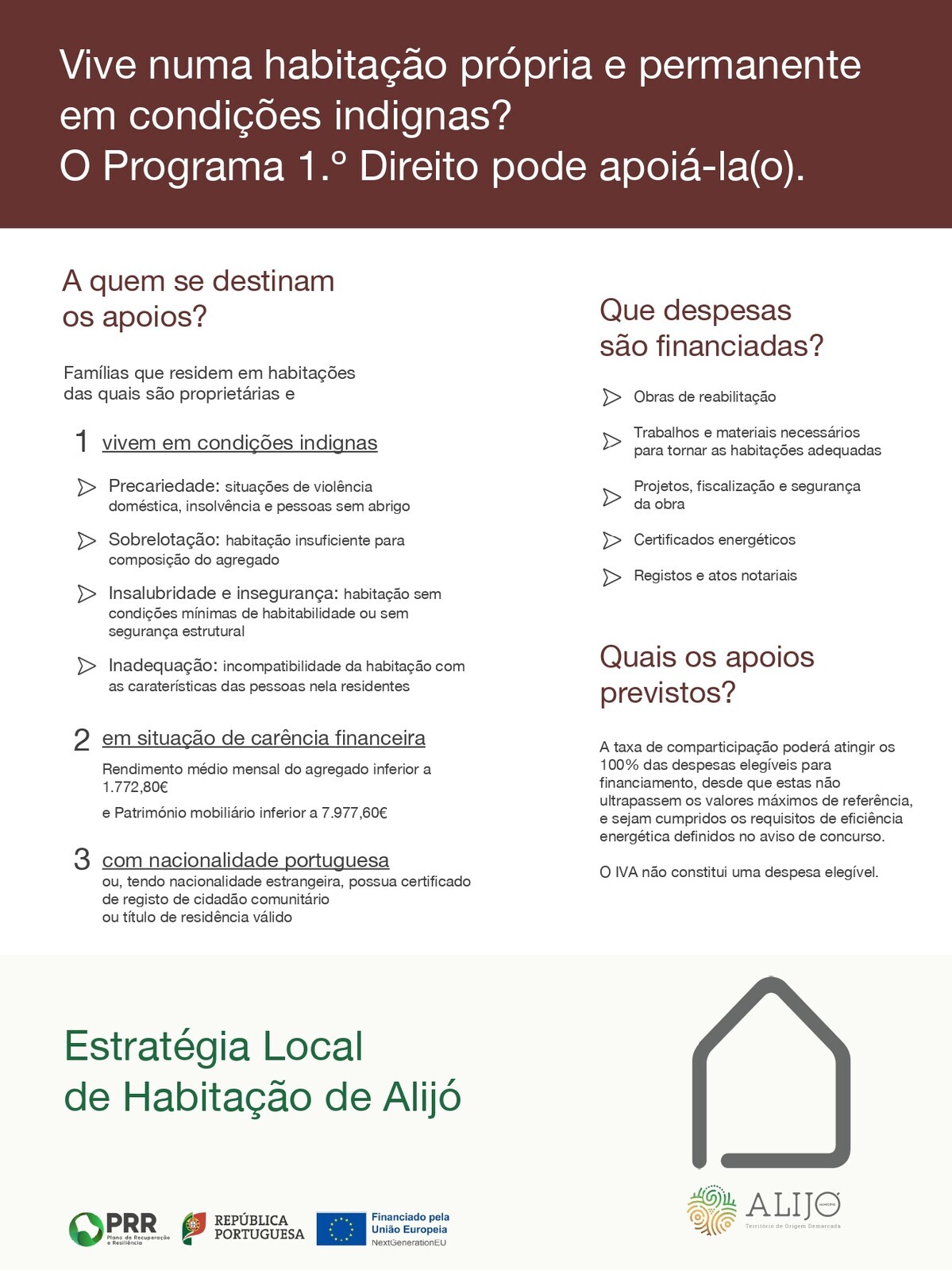 Integrado na Estratégia Local de Habitação do Município de Alijó, o Programa 1.º Direito promovido pelo Instituto da Habitação e Reabilitação Urbana (IHRU) visa apoiar financeiramente os agregados familiares com habitação própria permanente que vivem em condições indignas/precárias e que não têm condições para suportar as obras de reabilitação.