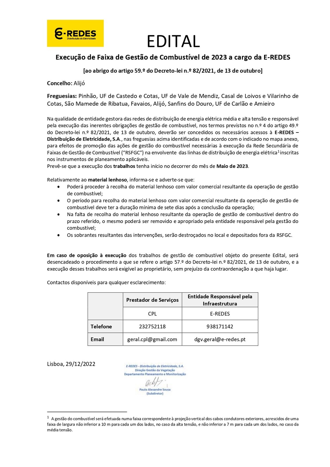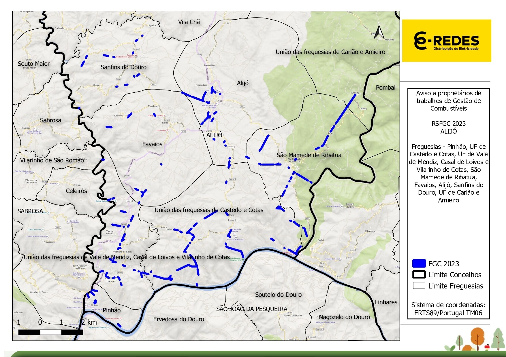 O Município de Alijó informa que a E-Redes, entidade gestora das redes de distribuição de energia elétrica média e alta tensão, vai proceder a trabalhos de limpeza nas faixas de combustível nas freguesias do Pinhão, UF de Castedo e Cotas, UF de Vale de Mendiz, Casal de Loivos e Vilarinho de Cotas, São Mamede de Ribatua, Favaios, Alijó, Sanfins do Douro e UF de Carlão e Amieiro.