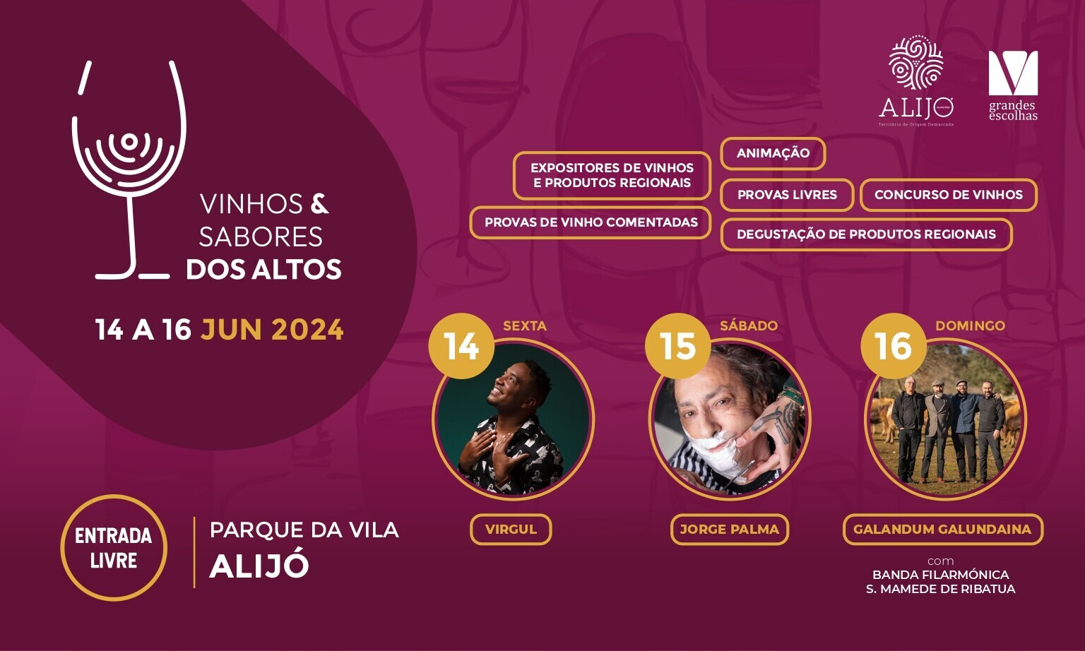 O vasto programa de três dias inclui o Concurso Escolha de Imprensa que vai eleger os melhores vinhos da região, provas comentadas, degustação de produtos e petiscos locais, muita animação e concertos com Virgul (sexta), Jorge Palma (sábado) e os Galandum Galundaina (domingo), que irão atuar em conjunto com a Banda Filarmónica de São Mamede de Ribatua, uma das mais antigas do País.