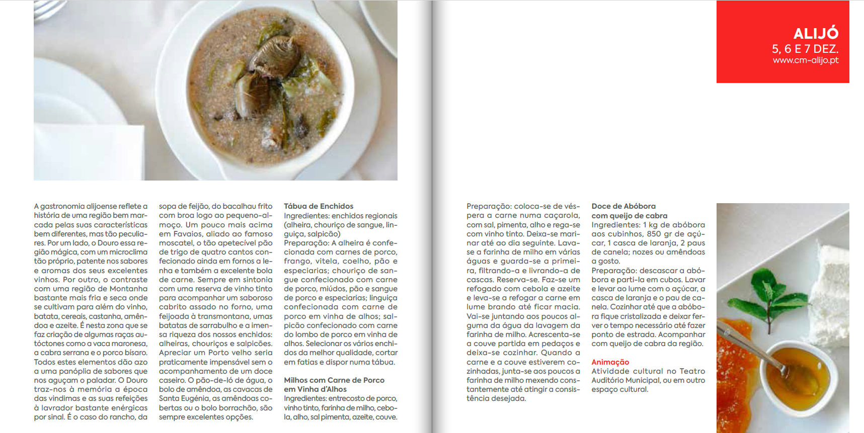 A edição deste ano dos Fins-de-Semana Gastronómicos decorrerá de 5 a 7 de dezembro, em vários pontos do Concelho de Alijó. Ao longo destes dias, os visitantes poderão saborear uma seleção de iguarias regionais nos restaurantes aderentes: desde apetitosas tábuas de enchidos como entrada, aos tradicionais e irresistíveis milhos com carne de porco em vinha-d’alhos como prato principal. Para finalizar, será servido um delicioso doce de abóbora com queijo de cabra, acompanhado por um copo dos excelentes vinhos da região, celebrando o melhor da gastronomia local.