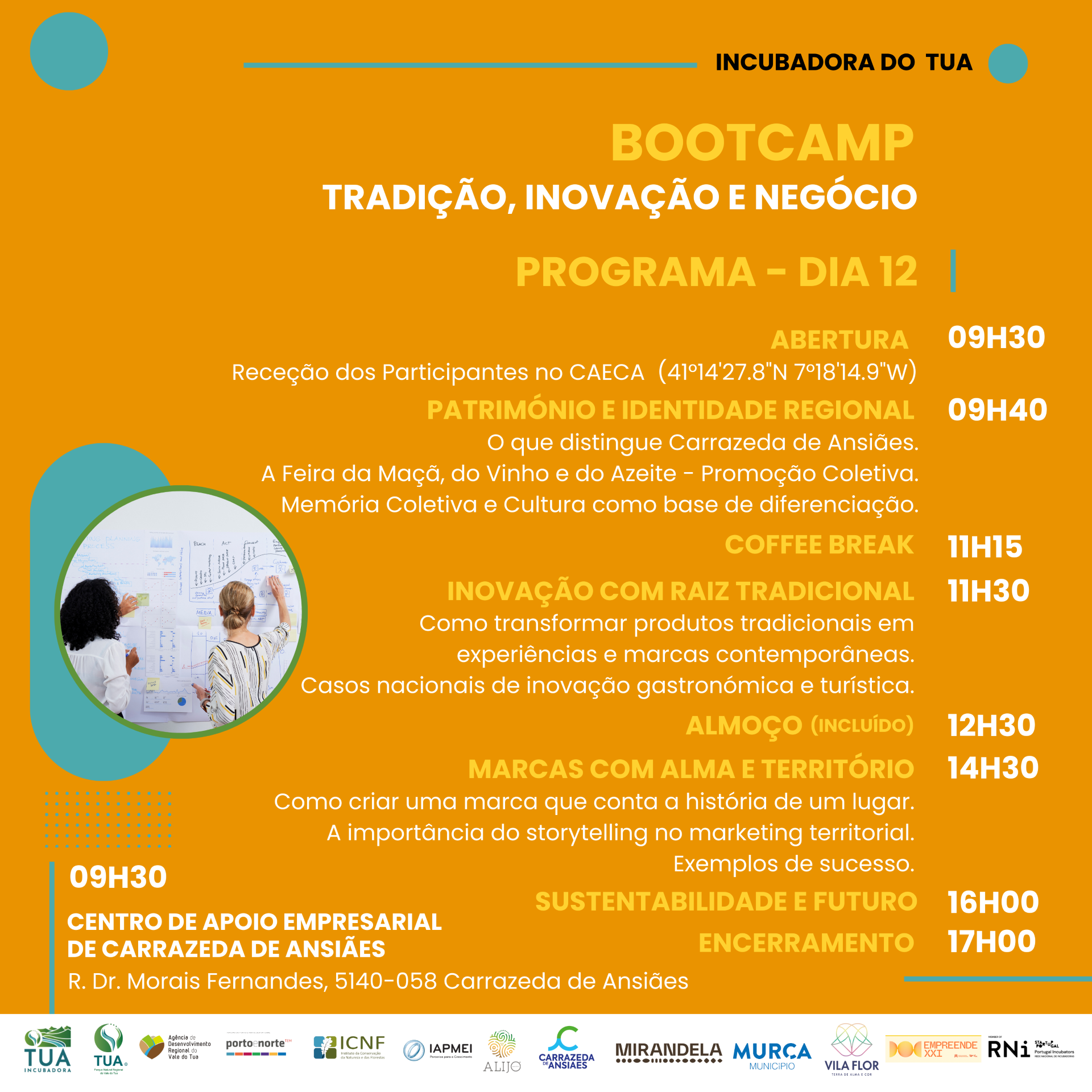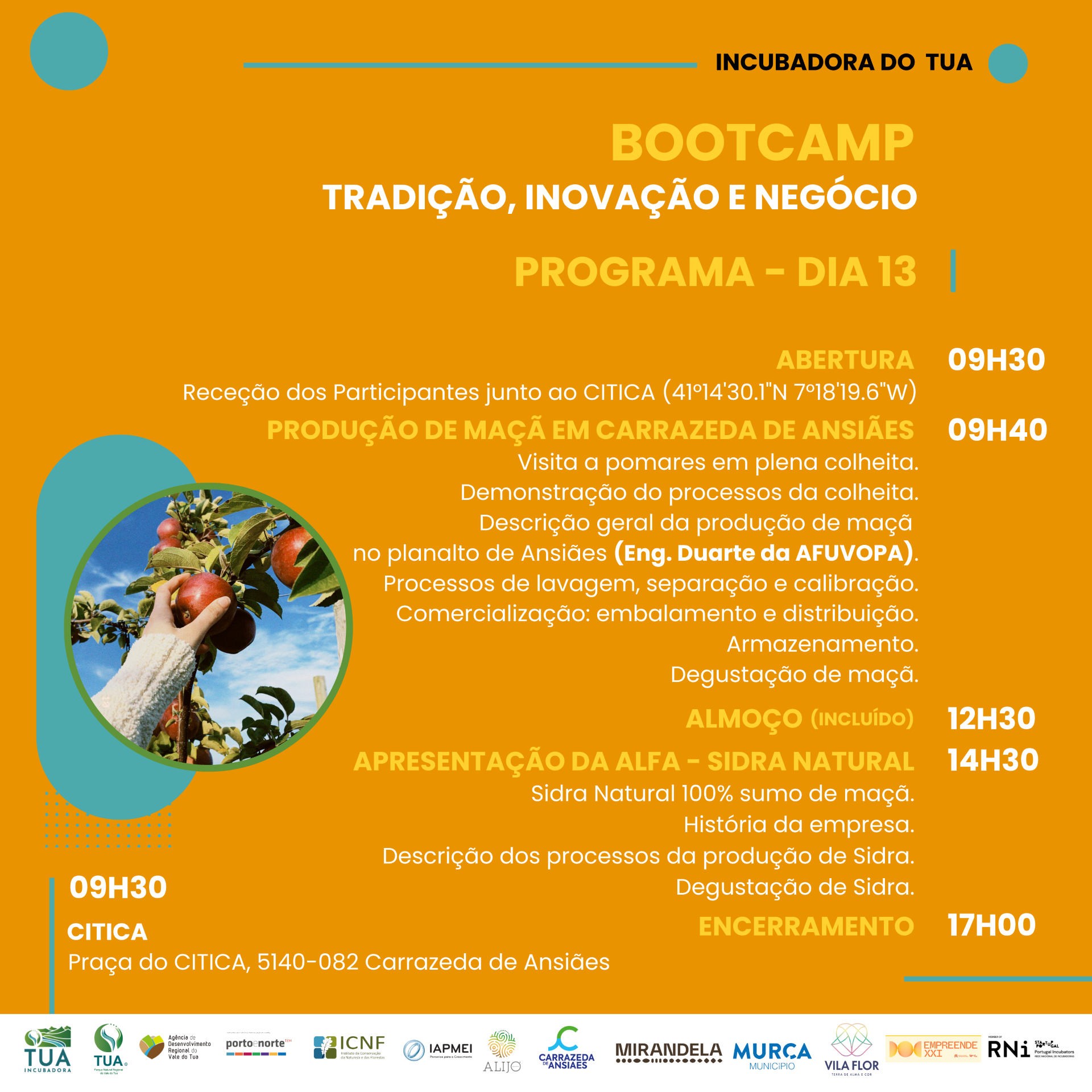 O Município de Alijó informa que a Incubadora do Tua vai promover um bootcamp dedicado à “Tradição, Inovação e Negócio”, no âmbito da Medida Empreende XXI, que se realizará nos dias 12 e 13 de setembro, em Carrazeda de Ansiães. Esta iniciativa liga património e identidade regional à inovação, criação de marcas com alma e sustentabilidade, e inclui visitas a pomares, demonstração da produção da maçã e degustação de sidra natural.