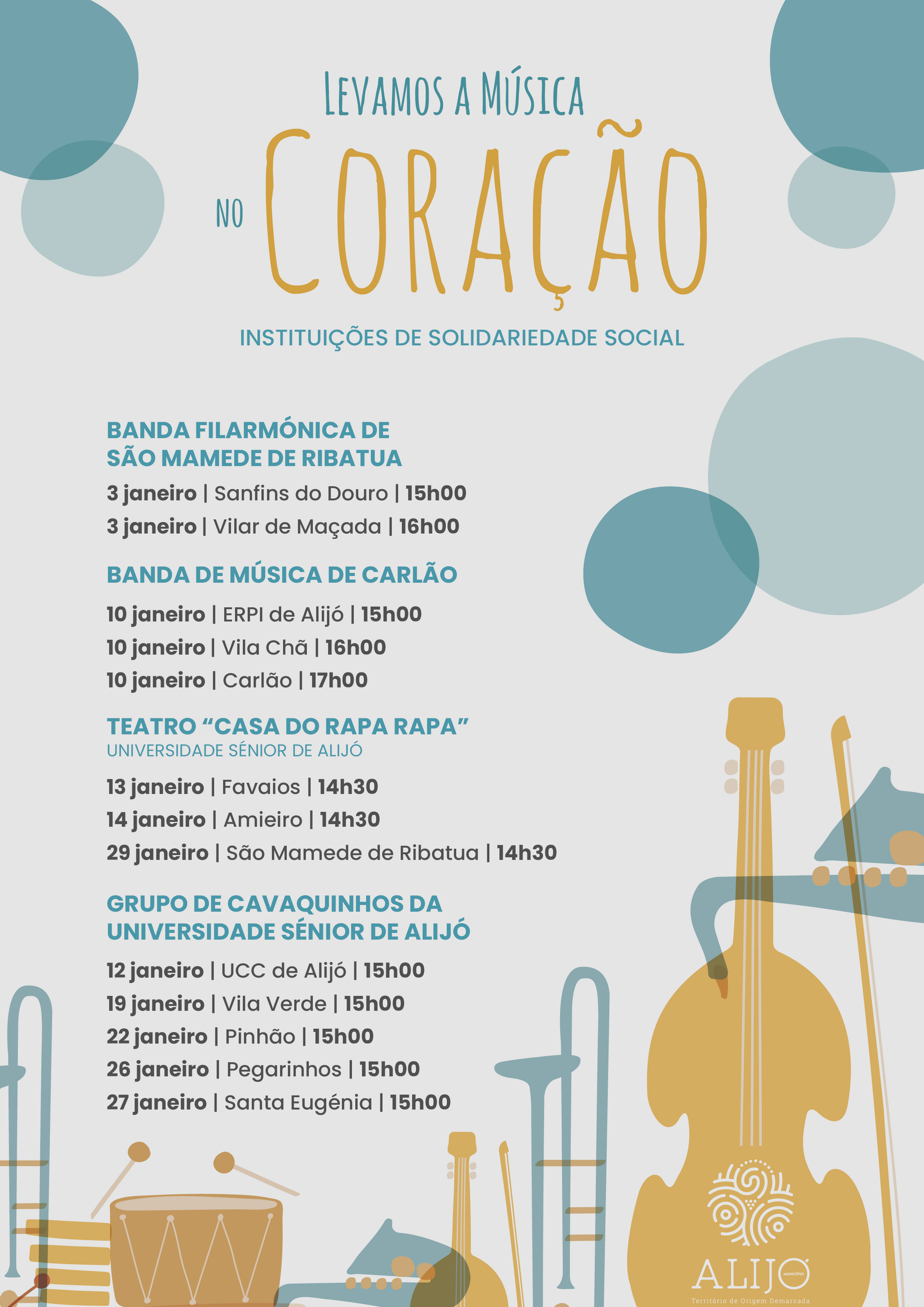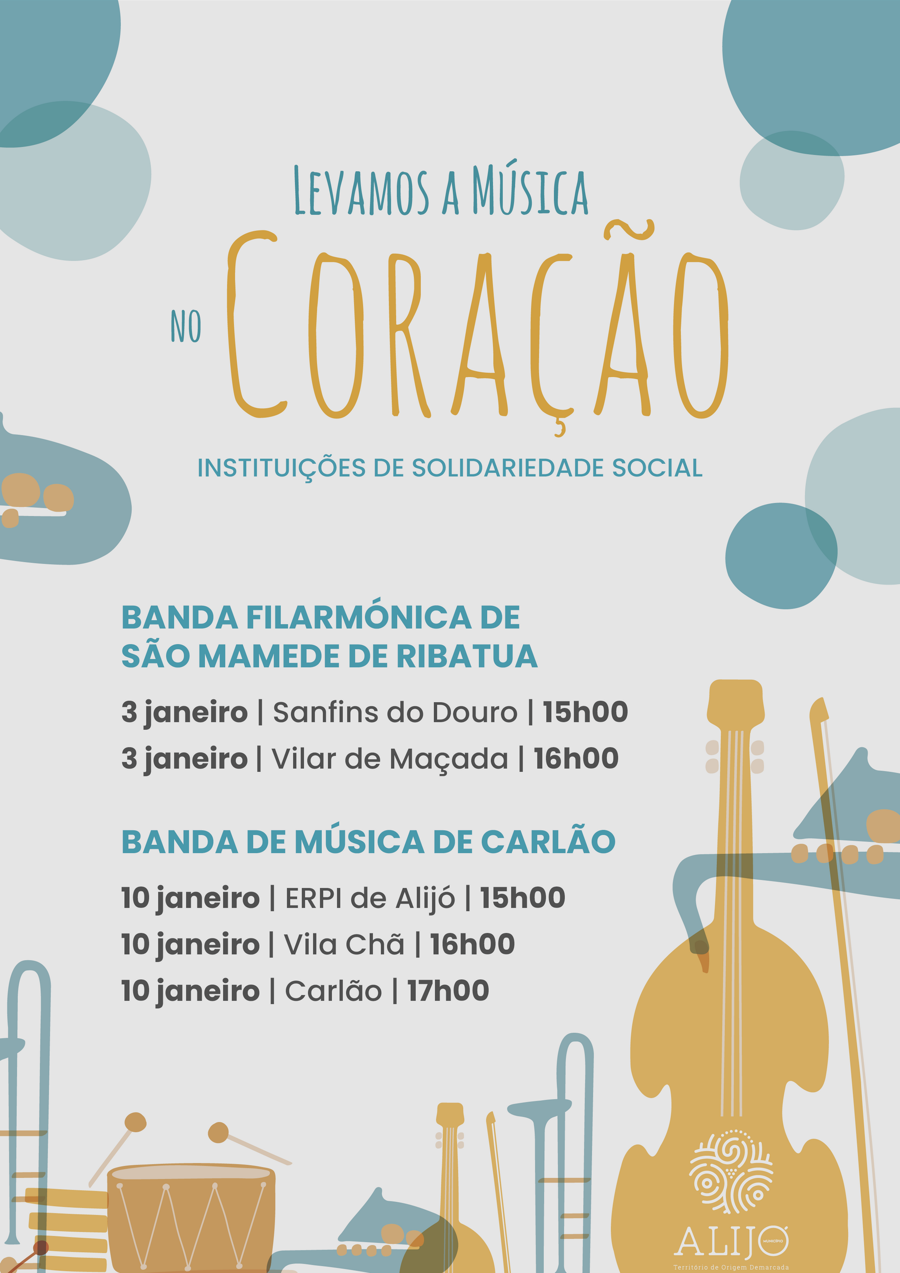 No próximo dia 3 de janeiro, arranca uma nova edição da iniciativa cultural e social “Levamos a Música no Coração”, promovida pelo Município de Alijó. Este projeto, que já conquistou o carinho da comunidade, tem como objetivo levar afetos através da música e do teatro aos idosos e utentes das Instituições Particulares de Solidariedade Social (IPSS) do Concelho, proporcionando momentos únicos de convívio e partilha.