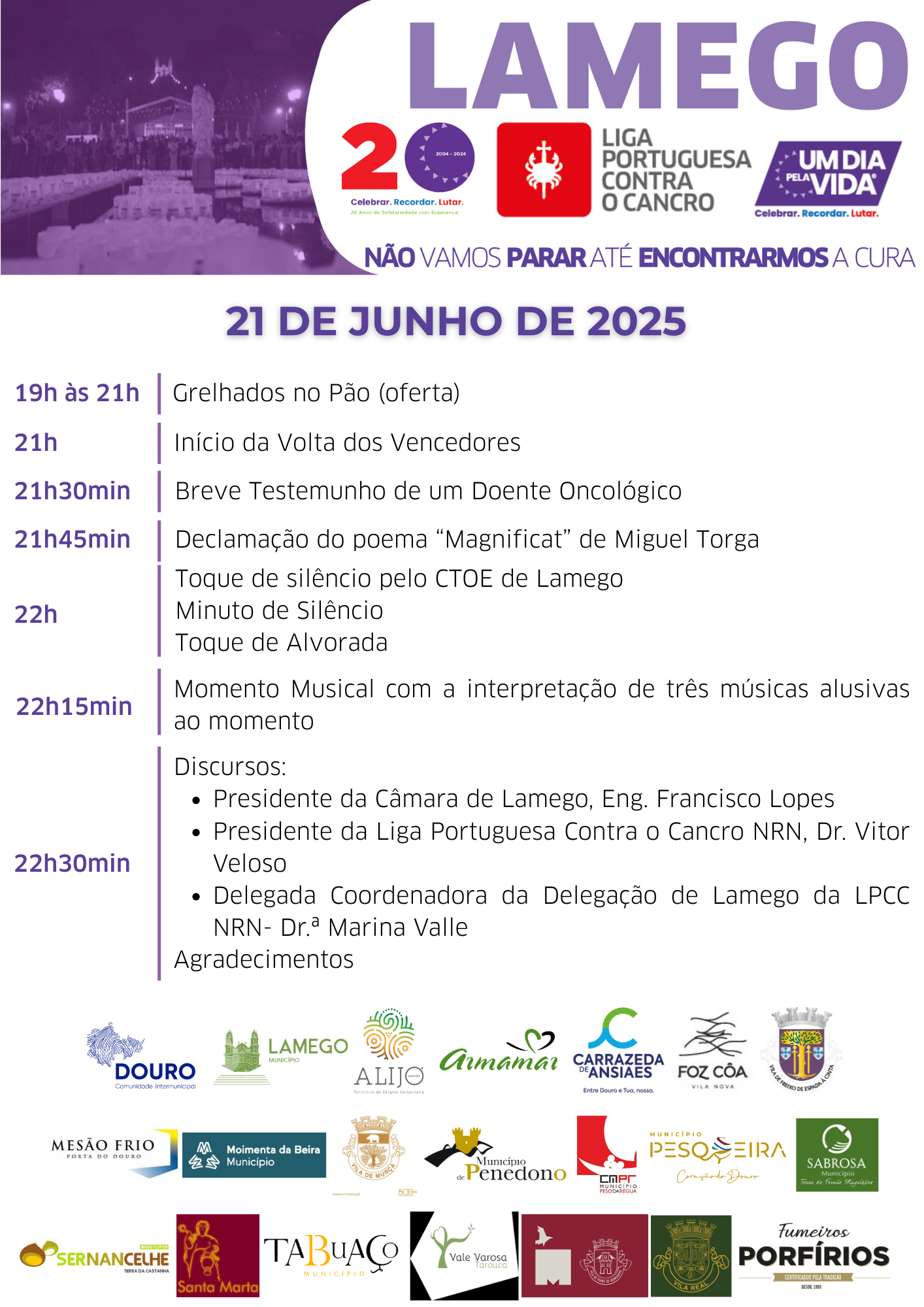 Durante a celebração serão colocadas luminárias nas taças da Avenida e Escadório de Nª Srª dos Remédios, num espetáculo de luz e esperança. Esta comunhão de objetivos dos Municípios da CIM Douro visam os três conceitos de “Um Dia Pela Vida”: celebrar, recordar, lutar - o apoio e acompanhamento ao doente oncológico e sua família e dar a conhecer que “Só Paramos Quando Encontrarmos a Cura”.