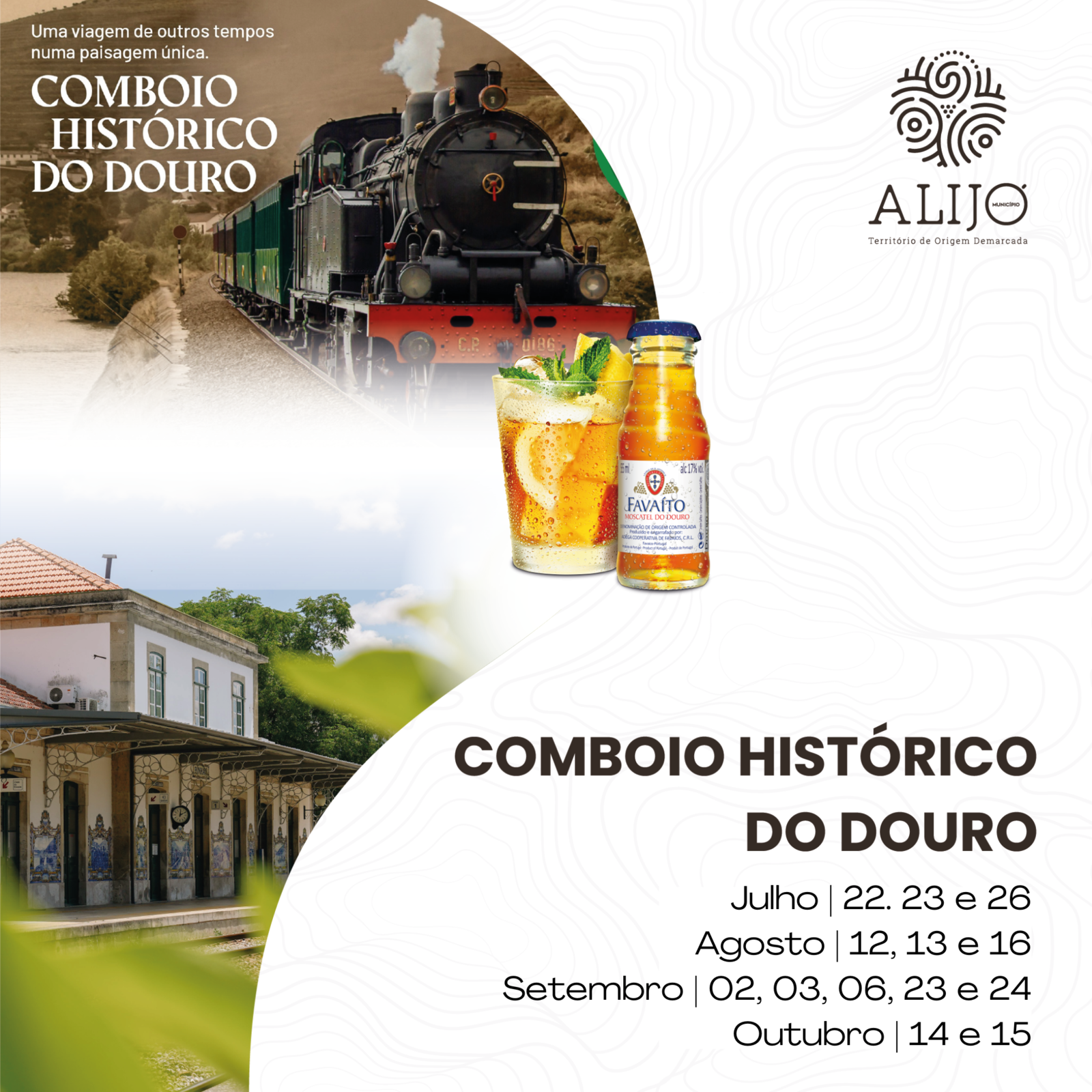 No âmbito de uma parceria de promoção dos produtos locais estabelecida entre o Município de Alijó e a CP - Comboios de Portugal, o Comboio Histórico do Douro vai oferecer Moscatel de Favaios aos turistas que vão fazer as viagens de 22, 23 e 26 de julho; de 12, 13 e 16 de agosto; de 02, 03, 06, 23 e 24 de setembro; e de 14 e 15 de outubro.