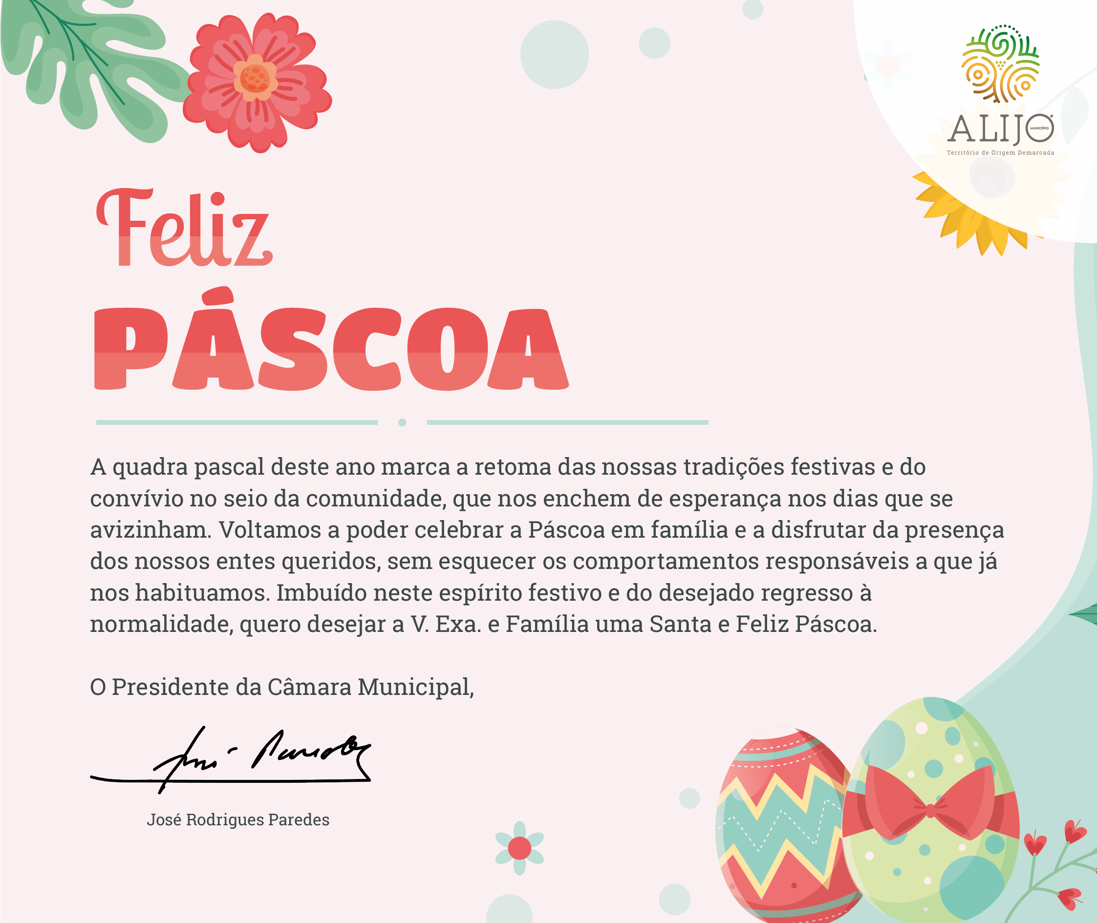 A quadra pascal deste ano marca a retoma das nossas tradições festivas e do convívio no seio da comunidade, que nos enchem de esperança nos dias que se avizinham. Voltamos a poder celebrar a Páscoa em família e a disfrutar da presença dos nossos entes queridos, sem esquecer os comportamentos responsáveis a que já nos habituamos. Imbuído neste espírito festivo e do desejado regresso à normalidade, quero desejar a V. Exa. e Família uma Santa e Feliz Páscoa.