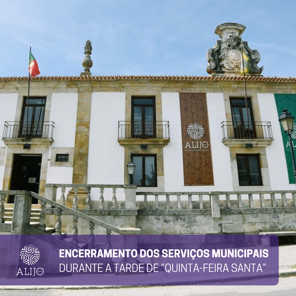 O Município de Alijó informa que os serviços municipais estarão encerrados durante a tarde da próxima quinta-feira, dia 02 de abril. Os serviços essenciais ao cumprimento do interesse público estarão assegurados durante o período em questão.