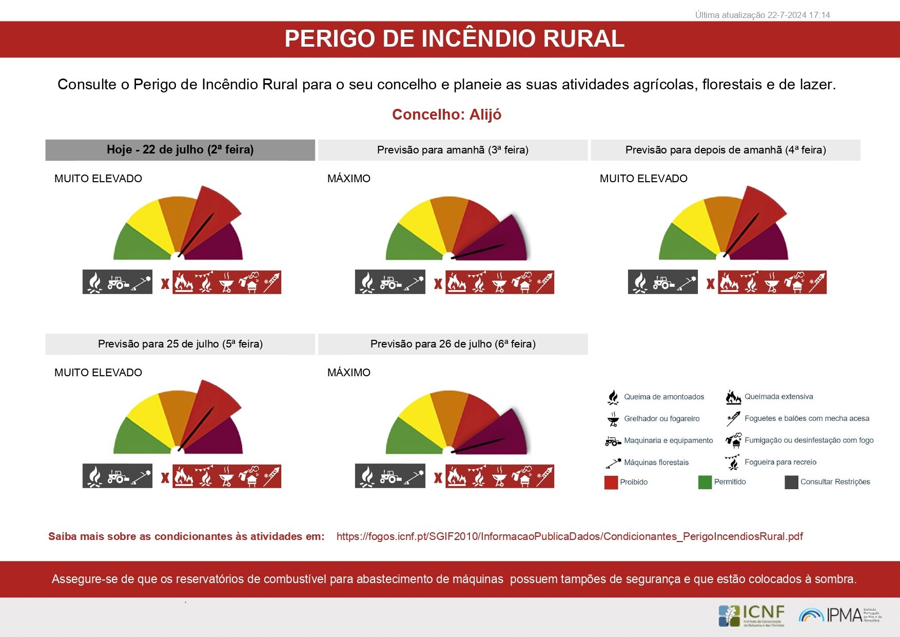 ⛔️ Nos dias de risco de incêndio Muito Elevado e Máximo É PROIBIDO utilizar fogo para a confeção de alimentos em todo o espaço rural, salvo se usados fora das zonas críticas e nos locais devidamente autorizados para o efeito;