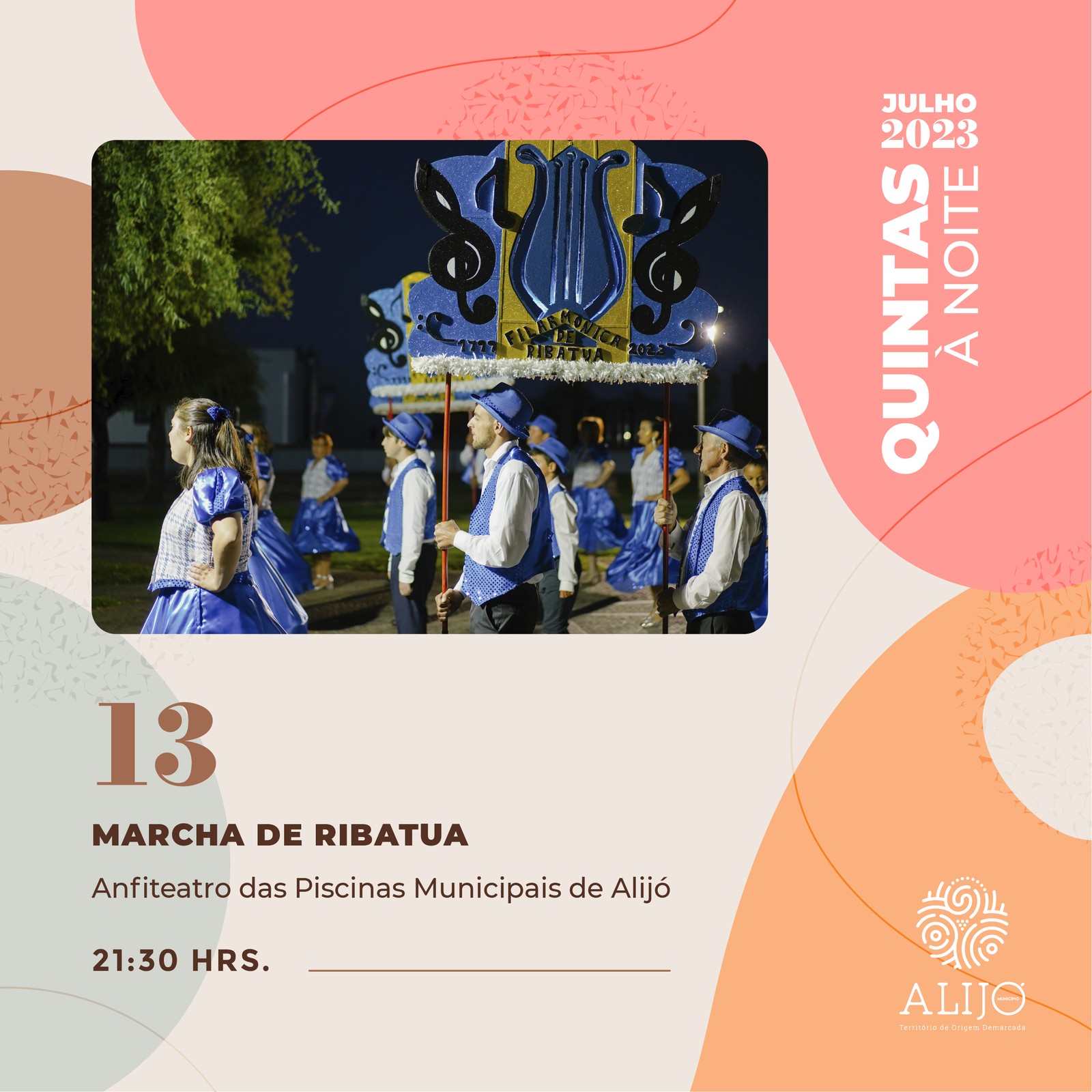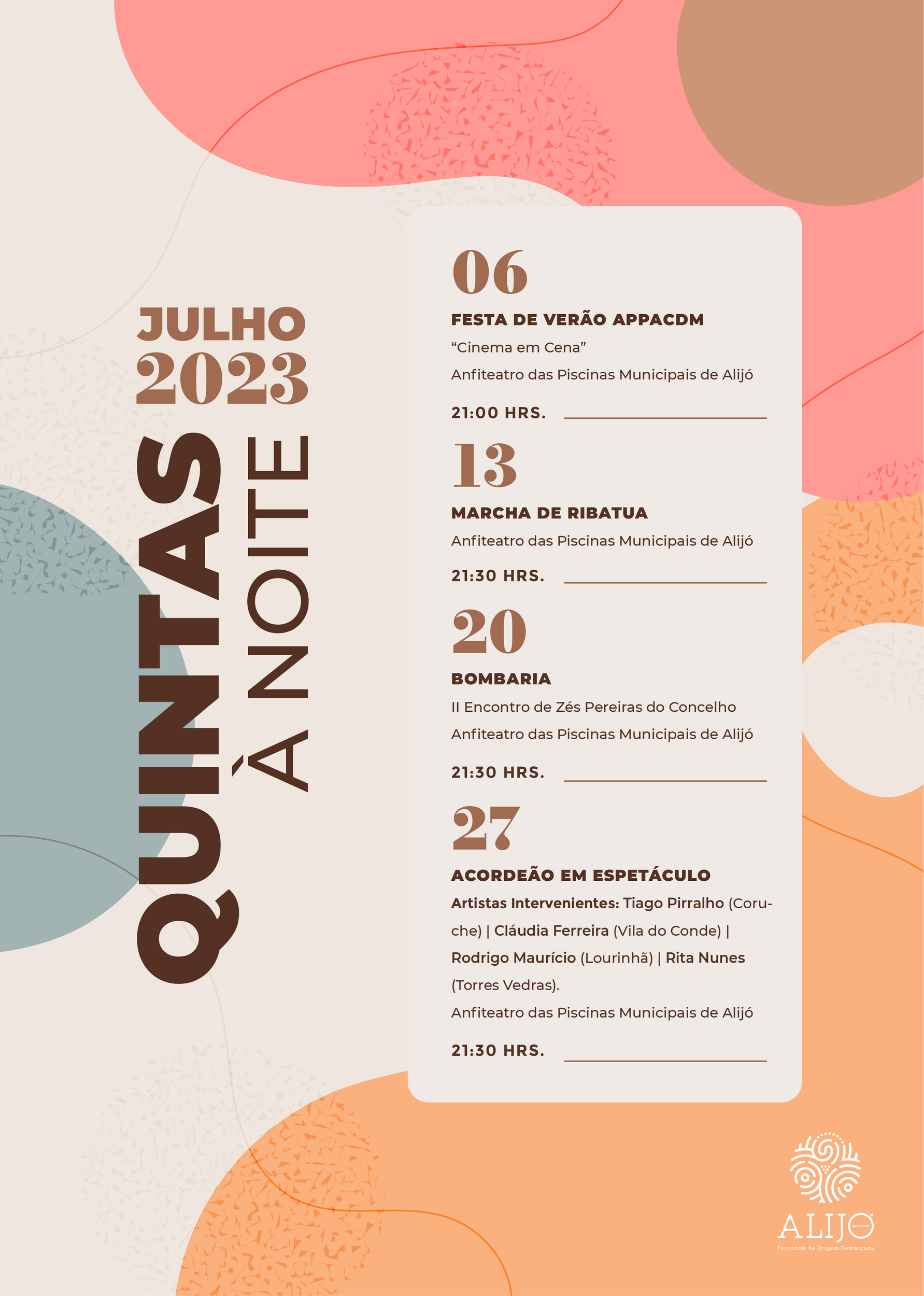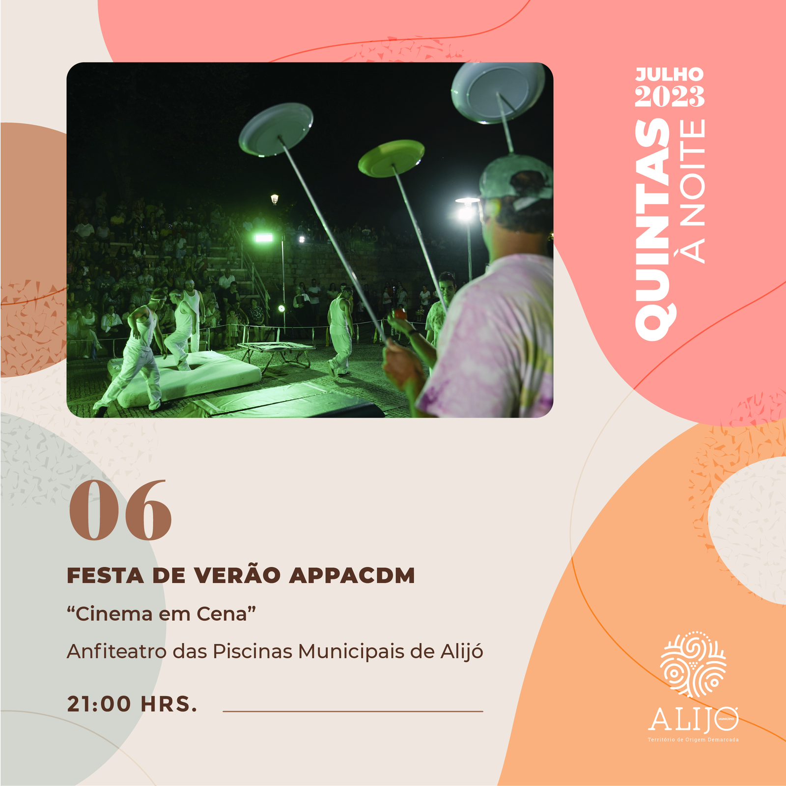 Com a chegada do verão, o Município de Alijó volta a privilegiar a cultura ao ar livre com a iniciativa “Quintas à Noite”, que inclui um programa diversificado e abrangente, dirigido a todos os públicos, que tem lugar no Anfiteatro das Piscinas Municipais.