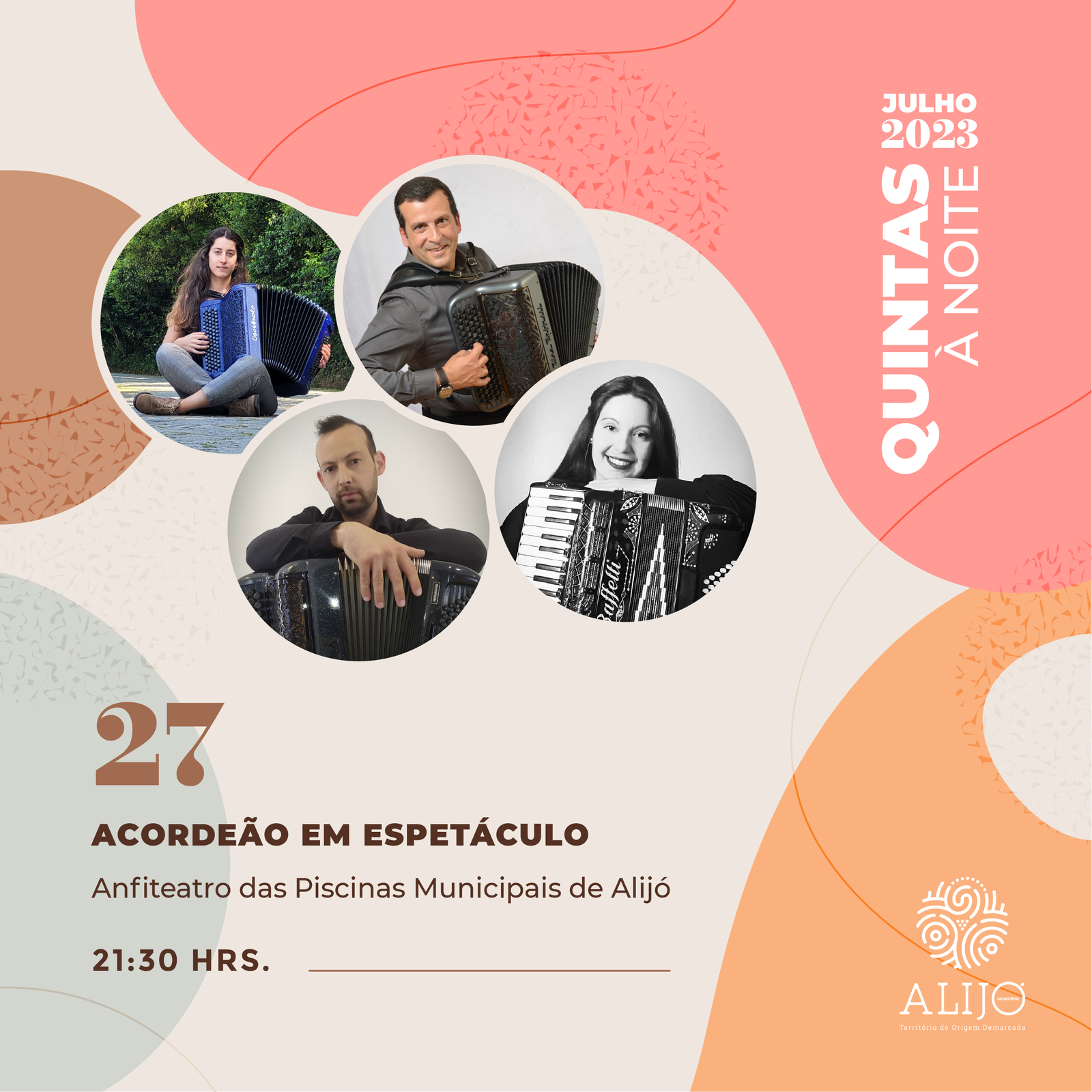 As “Quintas à Noite” terminam a 27 de julho, com o “Acordeão em Espetáculo” que conta com a presença dos artistas Tiago Pirralho, de Coruche, Cláudia Ferreira, de Vila do Conde, Rodrigo Maurício, da Lourinhã, e Rita Nunes, de Torres Vedras.