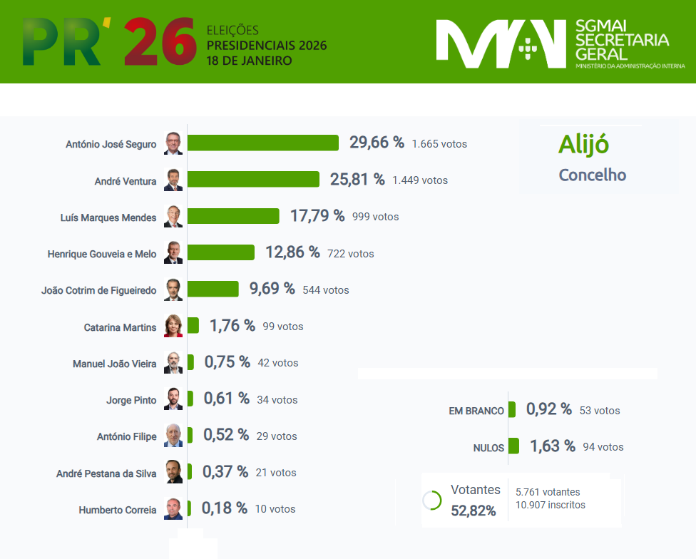 - Resultados da 1ª volta das Presidenciais 2026 - Concelho de Alijó