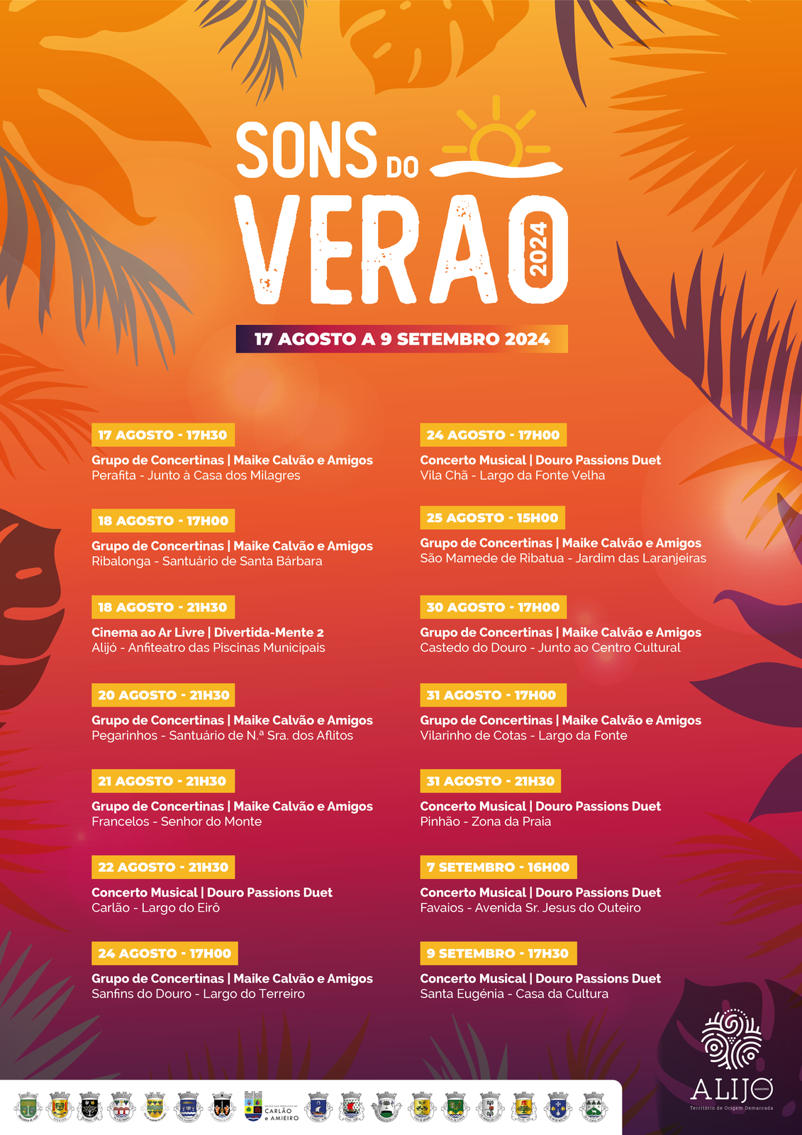 Entre 17 de agosto e 09 de setembro, o Município de Alijó vai promover a iniciativa “Sons do Verão” em todas as freguesias do Concelho. A iniciativa cultural arranca com música no dia 17 de agosto, em Perafita, na Freguesia de Vila Verde. Ao todo, serão 14 sessões que vão proporcionar espetáculos musicais e cinema ao ar livre.